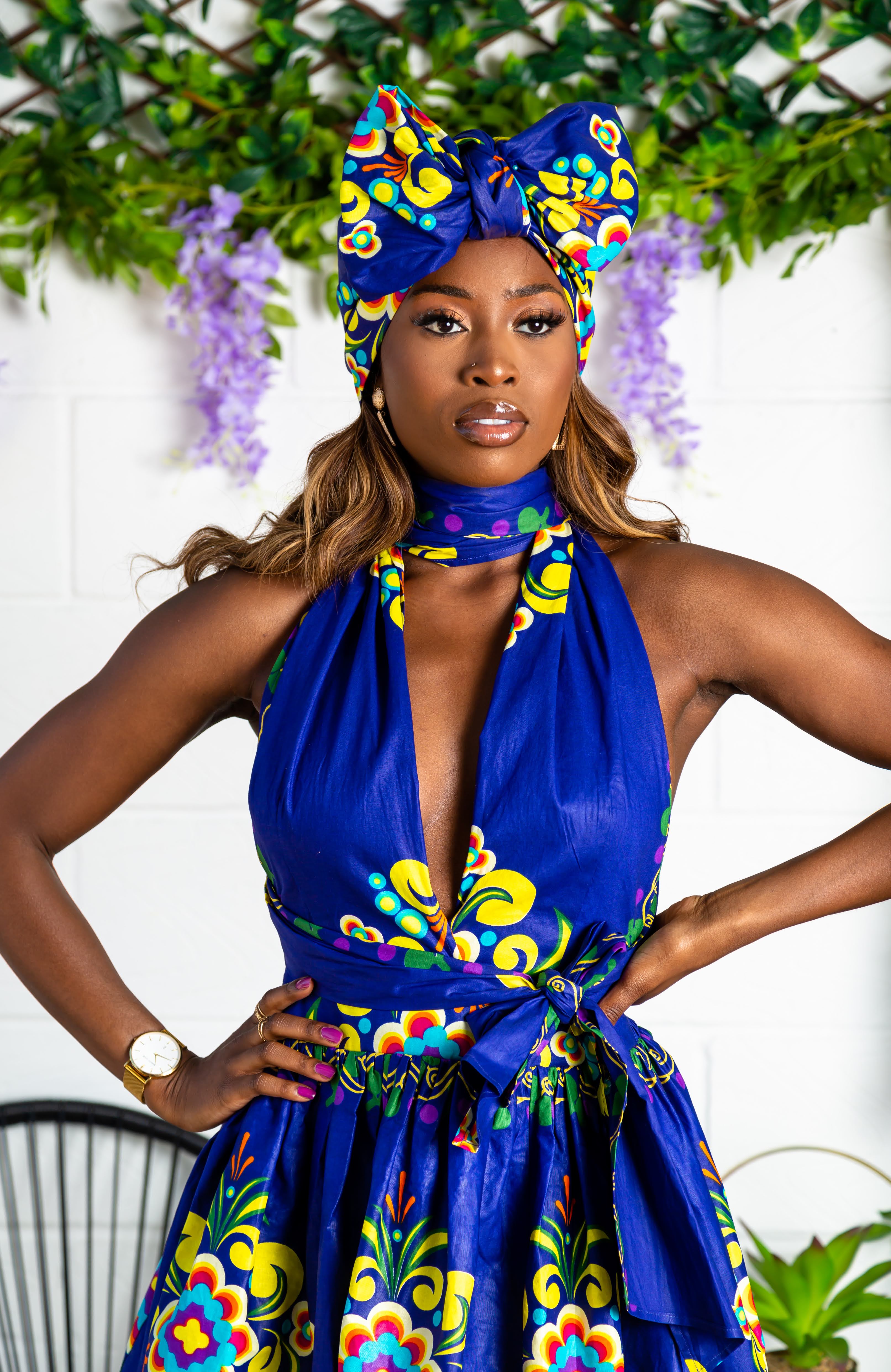 LAVIYE's stunning African print blue infinity / multiway maxi dress. Perfect and quite popular as a bridesmaid dress. Can be worn in over 6 different stylish ways! Just wrap the two long African print wax straps around your body in whatever way you desire to create a different look each time! This beautiful African floral print is sure to grab the attention of any room you walk in.