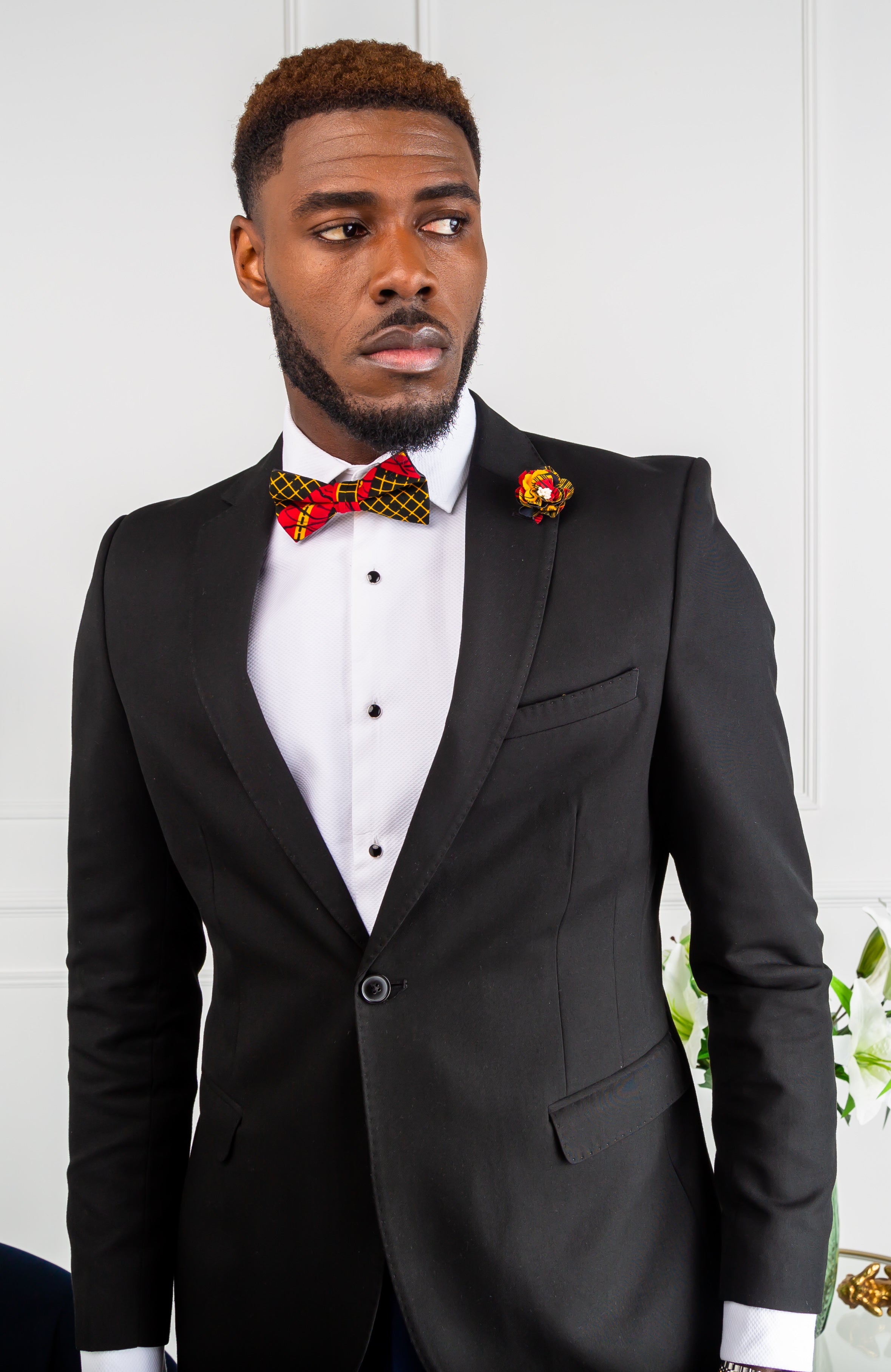 Our Tie set comes with a long neck tie, matching pocket square, pre-tied bow tie, medium flower pin and a pair of cuff links that are sure to add a splash of colour to any gentleman's jacket or blazer.