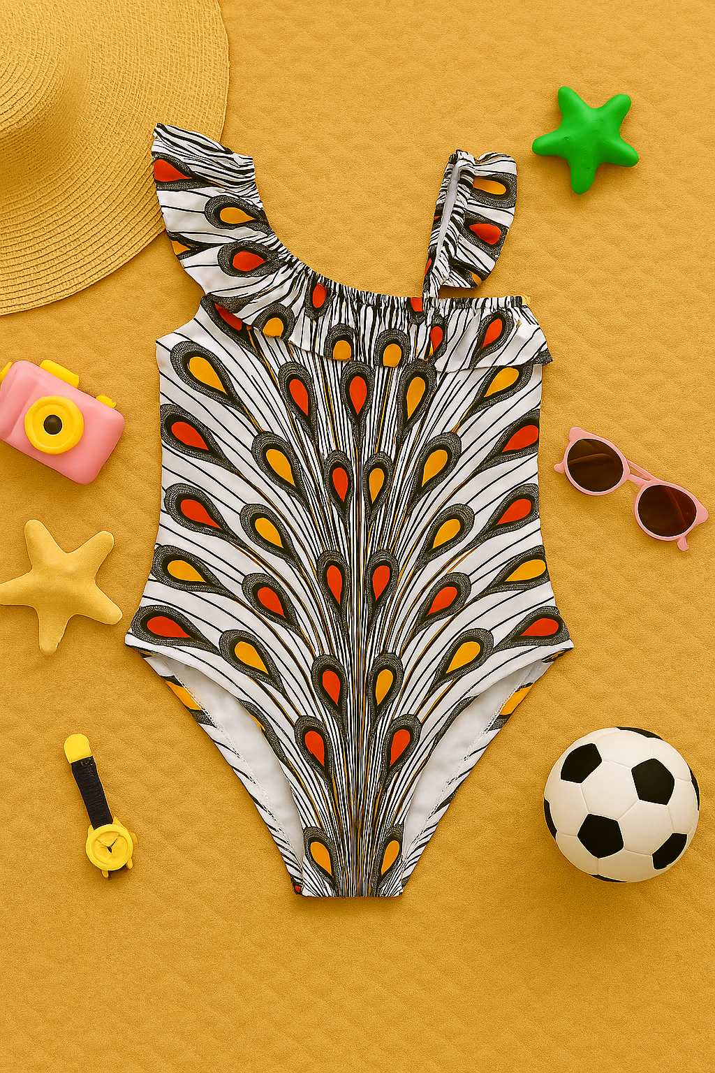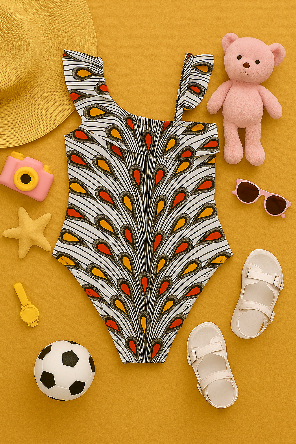 Crafted with love and culture, this Ankara-inspired swimsuit blends comfort, confidence, and heritage in one statement piece. Featuring a crisp white base with vibrant red, yellow, and black teardrop patterns, plus a double ruffle strap detail for extra flair—perfect for stylish little girls who love to twirl, splash, and play.