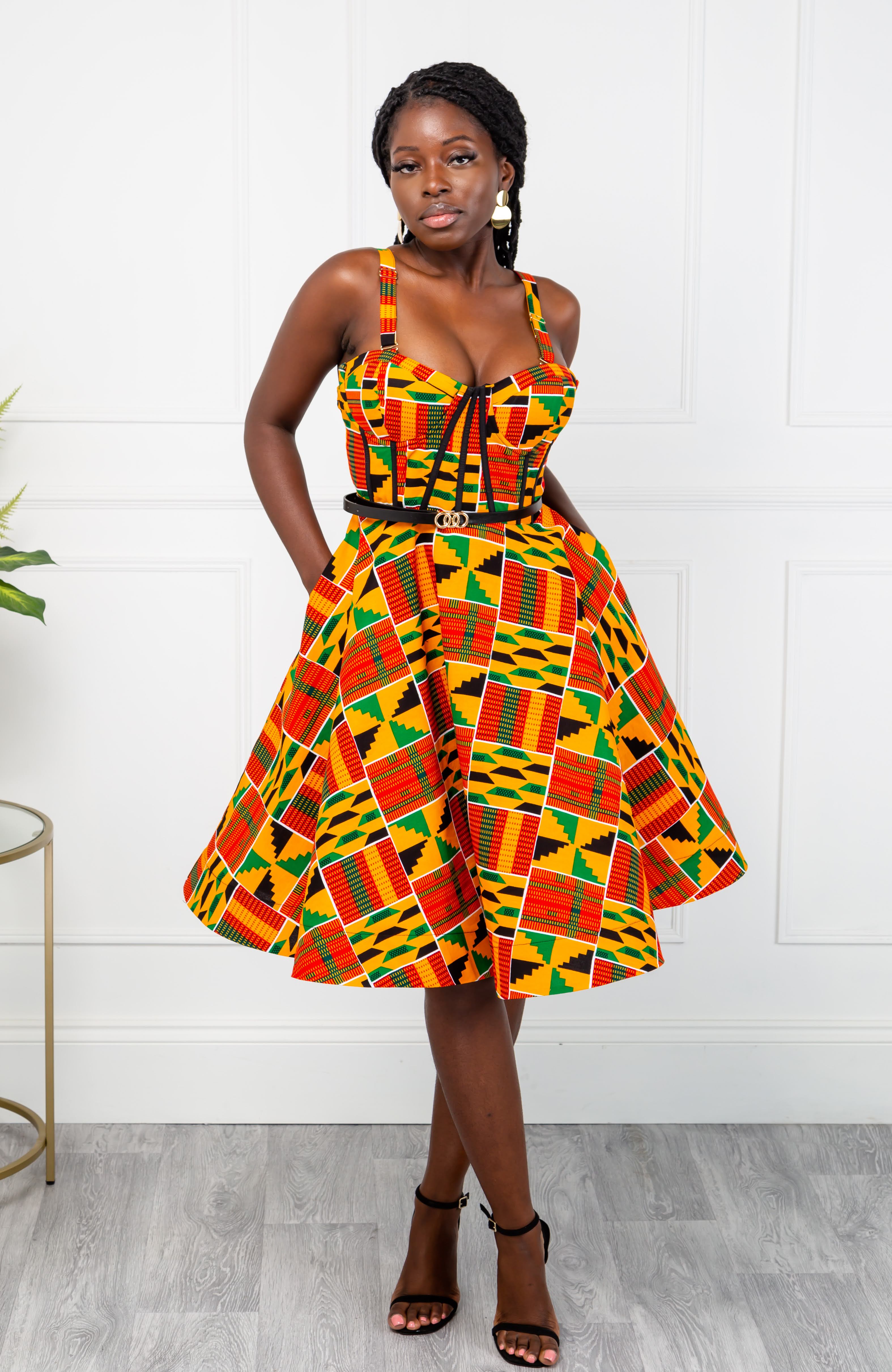 Kente African Print Fit & Flare Corset Midi Dress - KENYA