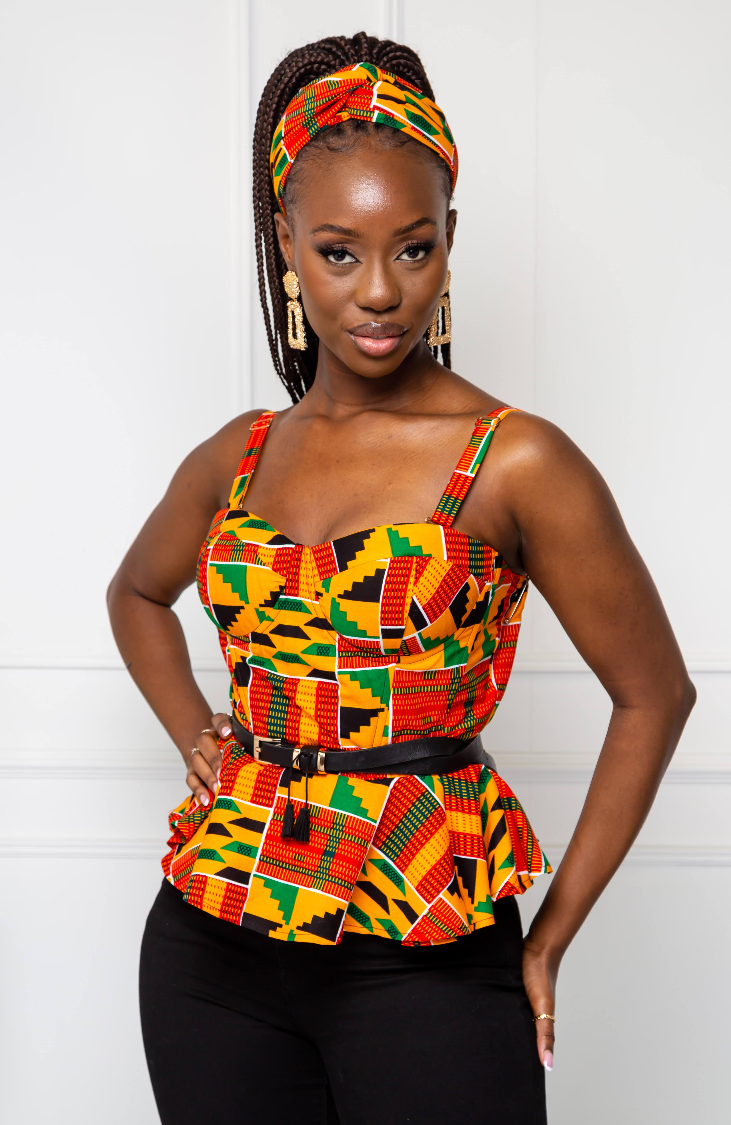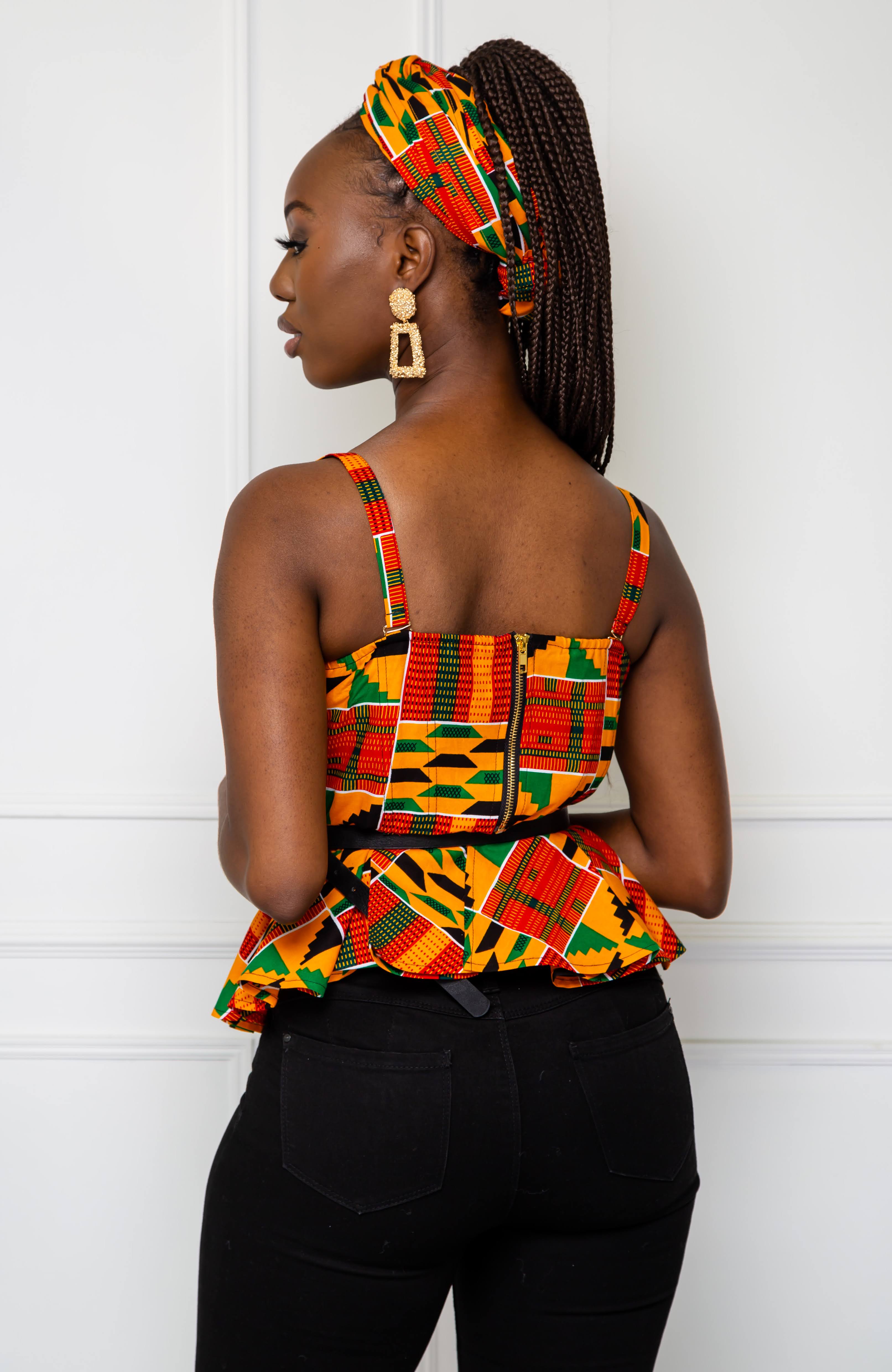 Our sexy African print peplum corset is cut from a bold Ankara wax fabric. This stylish African corset is cut to fit your silhouette perfectly and accentuate a slim waist. A feminine, sophisticated design, our Ankara corset features proper corsetry boning for additional support, a detachable adjustable strap and a contrasting gold zipper to the back for easy on. Wear your African print peplum corset with denim and killer heels for a sexy, sophisticated look.