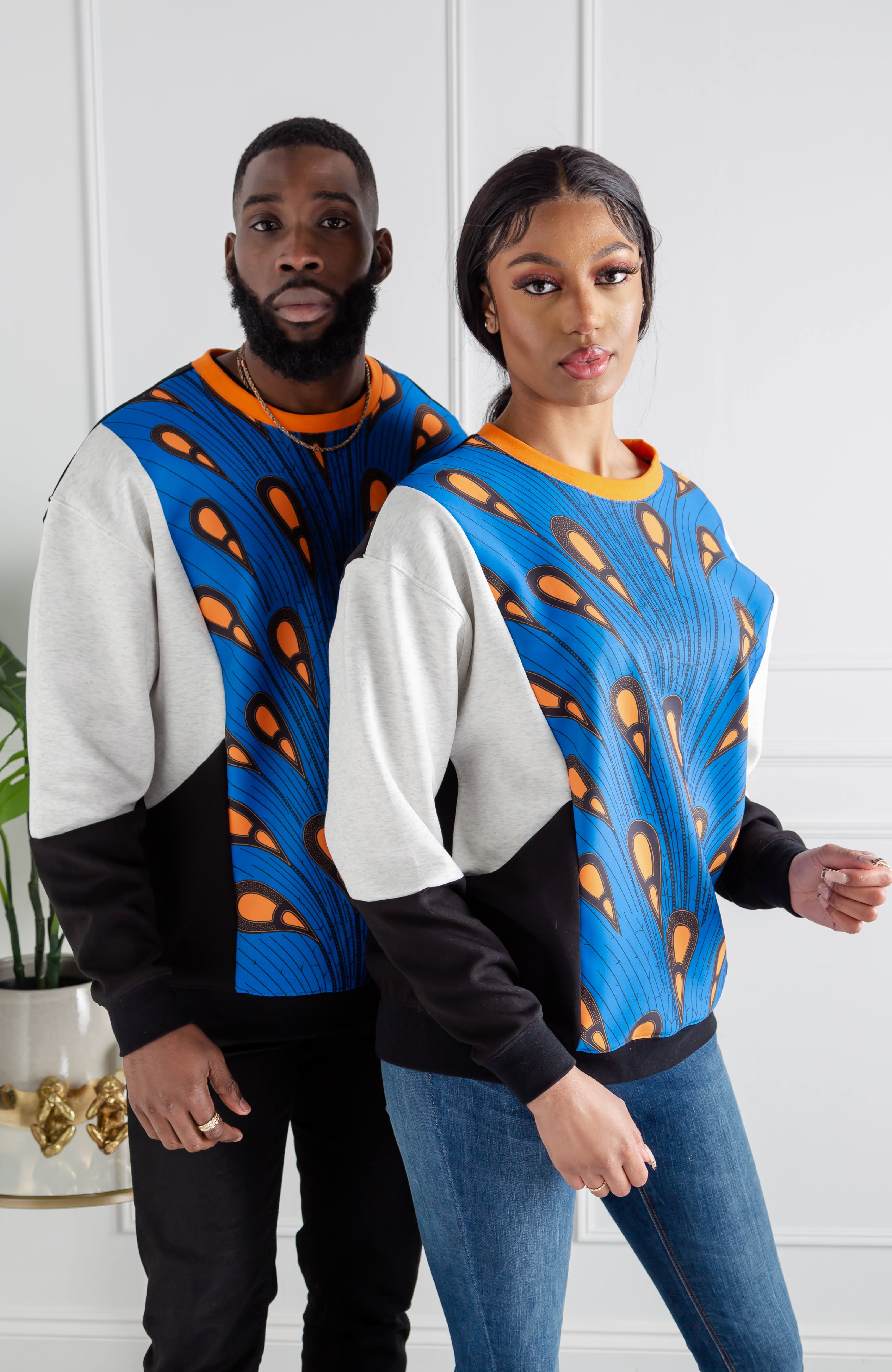 When you wear our Unisex African Print Crew Neck Sweatshirt, everyone’s going to want to know how they can get one, too! Featuring a vibrant blue V Block Ankara Pattern on the front, elasticated waistband, and two-tone cuffed sleeves, the Enugu sweatshirt is the ultimate example of Unisex African Sweatshirt. Whether you decide to wear your Unisex African Crew Neck Sweatshirt to the mall or on the couch, you’re guaranteed to feel amazing! Our V Block Ankara Pattern Sweatshirt has been thoughtfully designed to look incredible on everyone, everywhere!