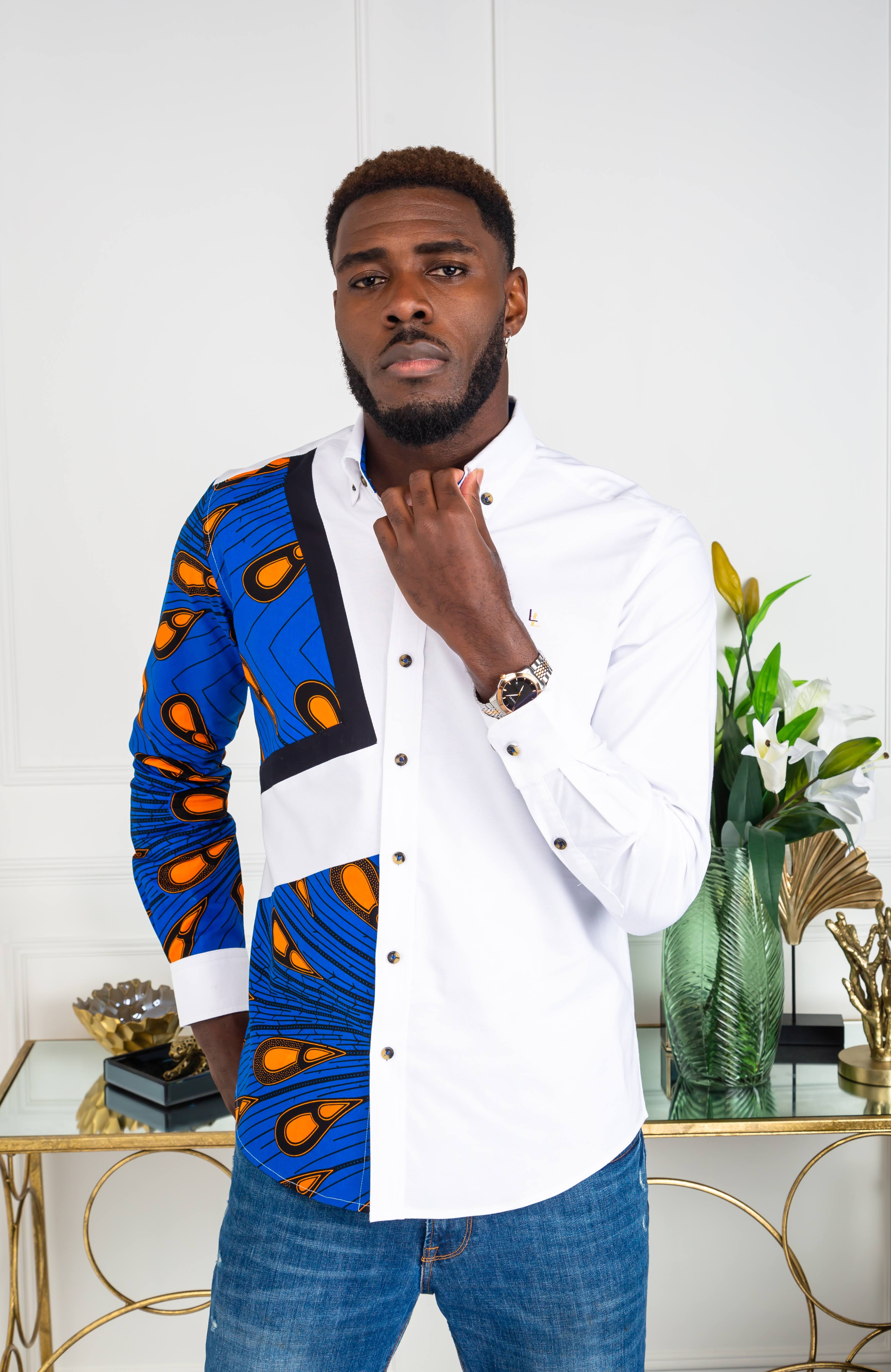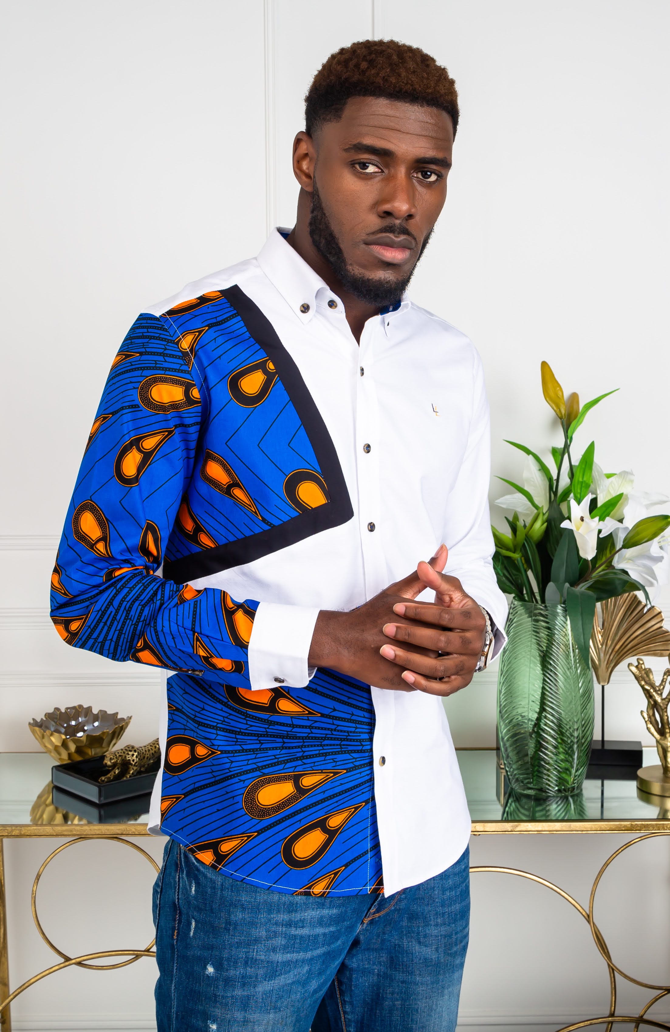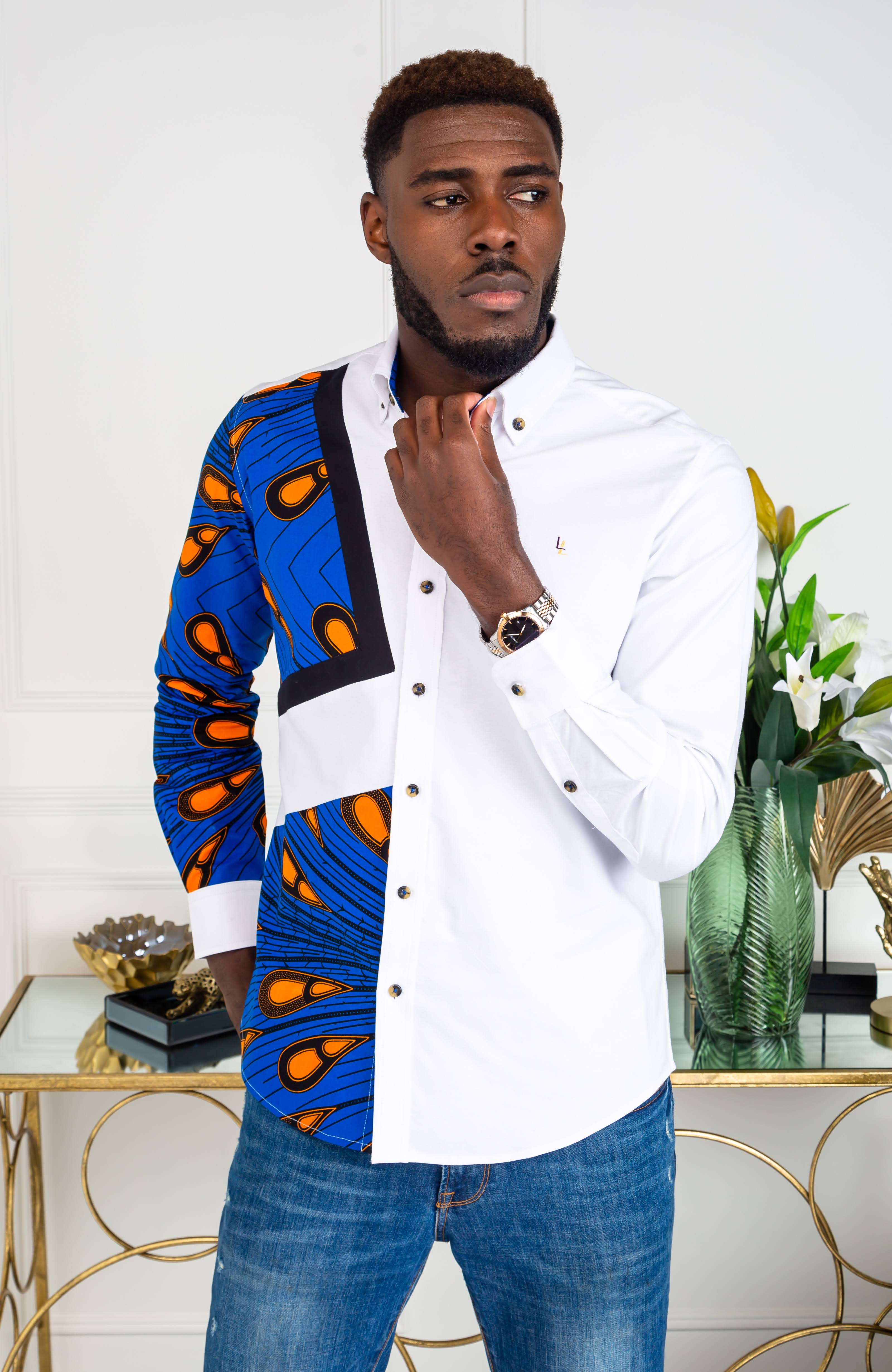 Classic style gets a cultural update in this L'AVIYE African print men's shirt. Cut in a skinny fit to define your frame, this African shirt creates a sharp outline around your silhouette. The 100% cotton fabric will deliver the breathability and comfort you want from a staple shirt.