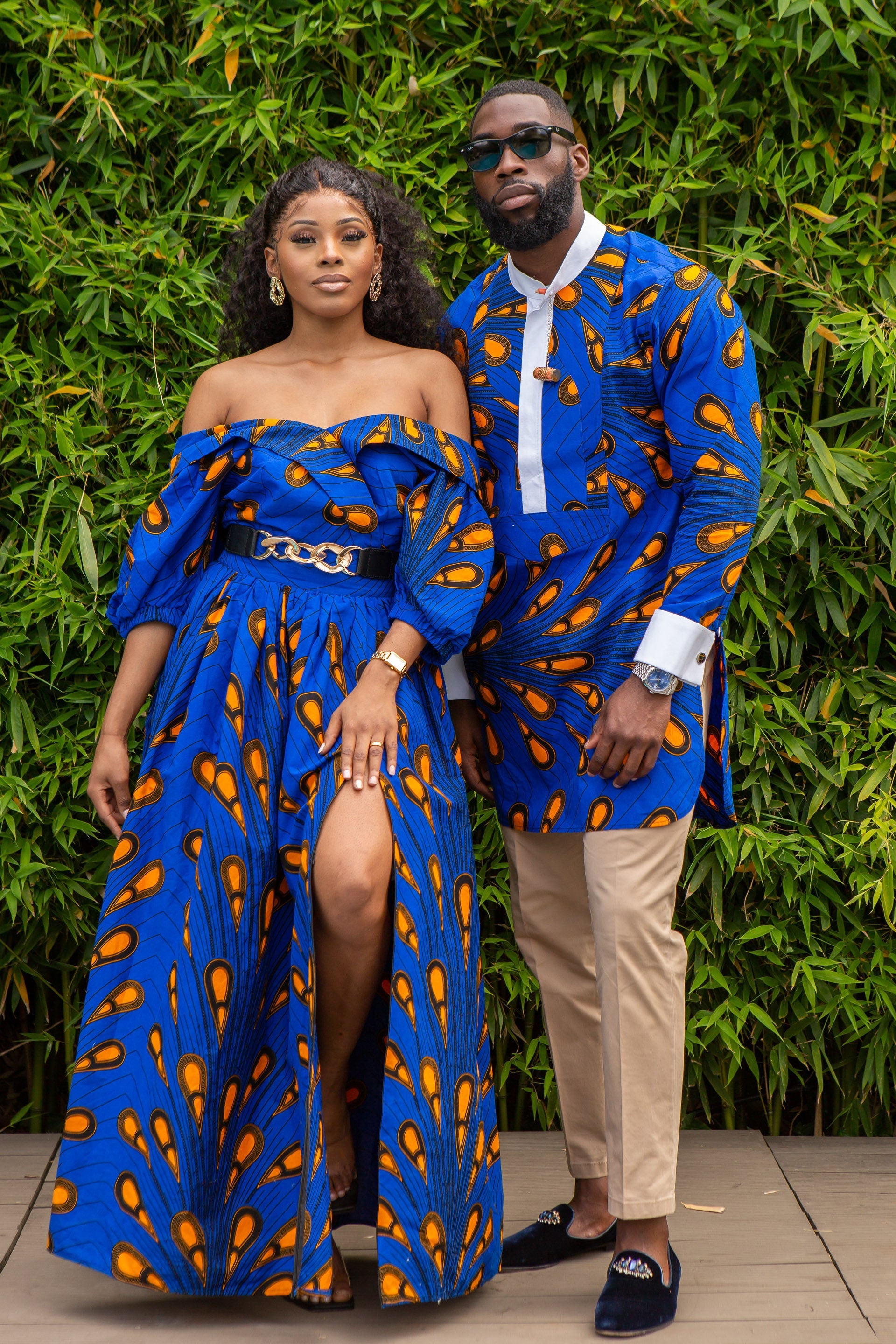 The pieces are beautifully made with great quality! The men’s shirt allows you to wear cuff links and the dress is gorgeous and has an invisible zipper for the split! You have the option to wear it open or closed and it goes all the way up to the thigh! I love it!