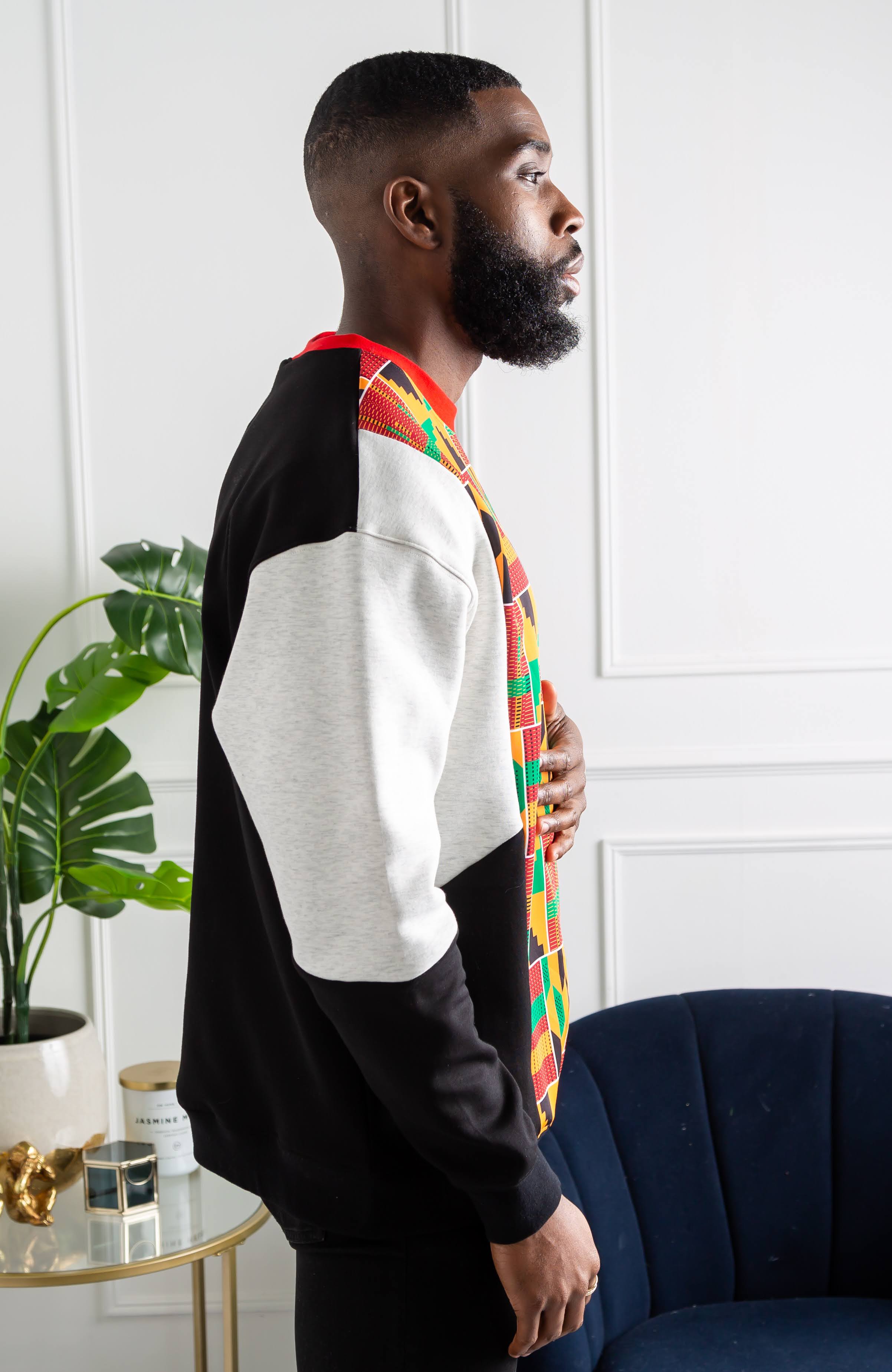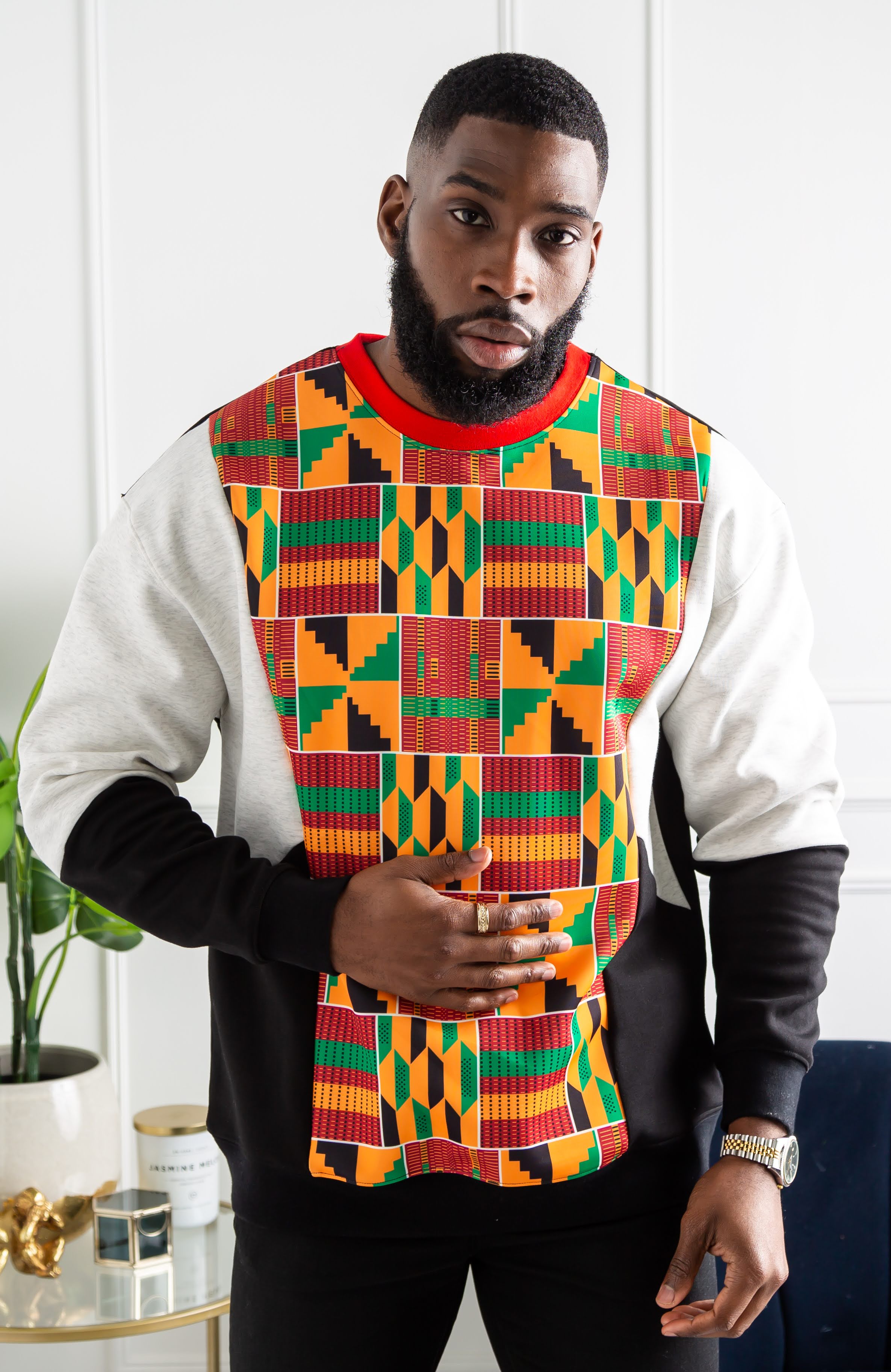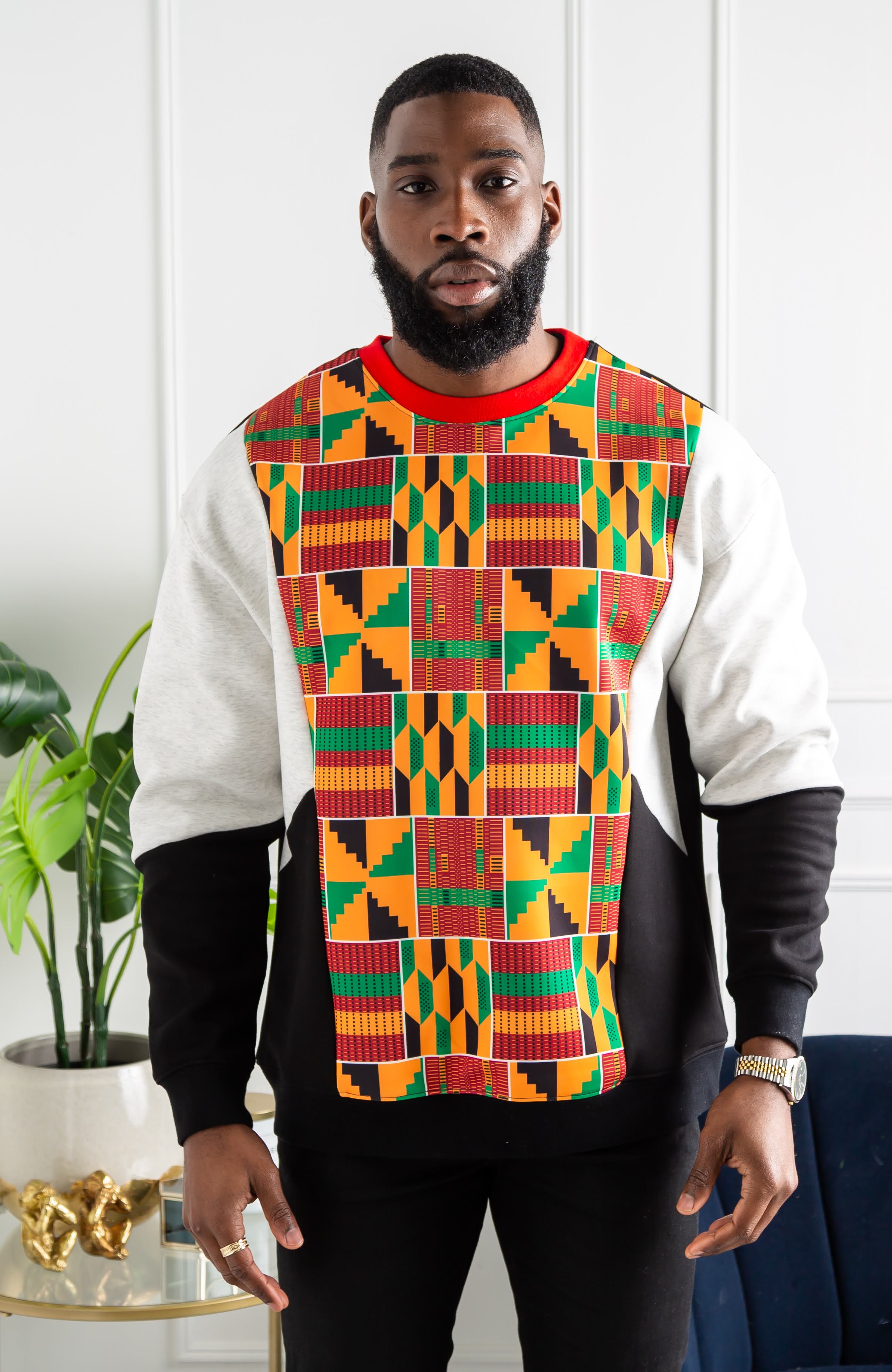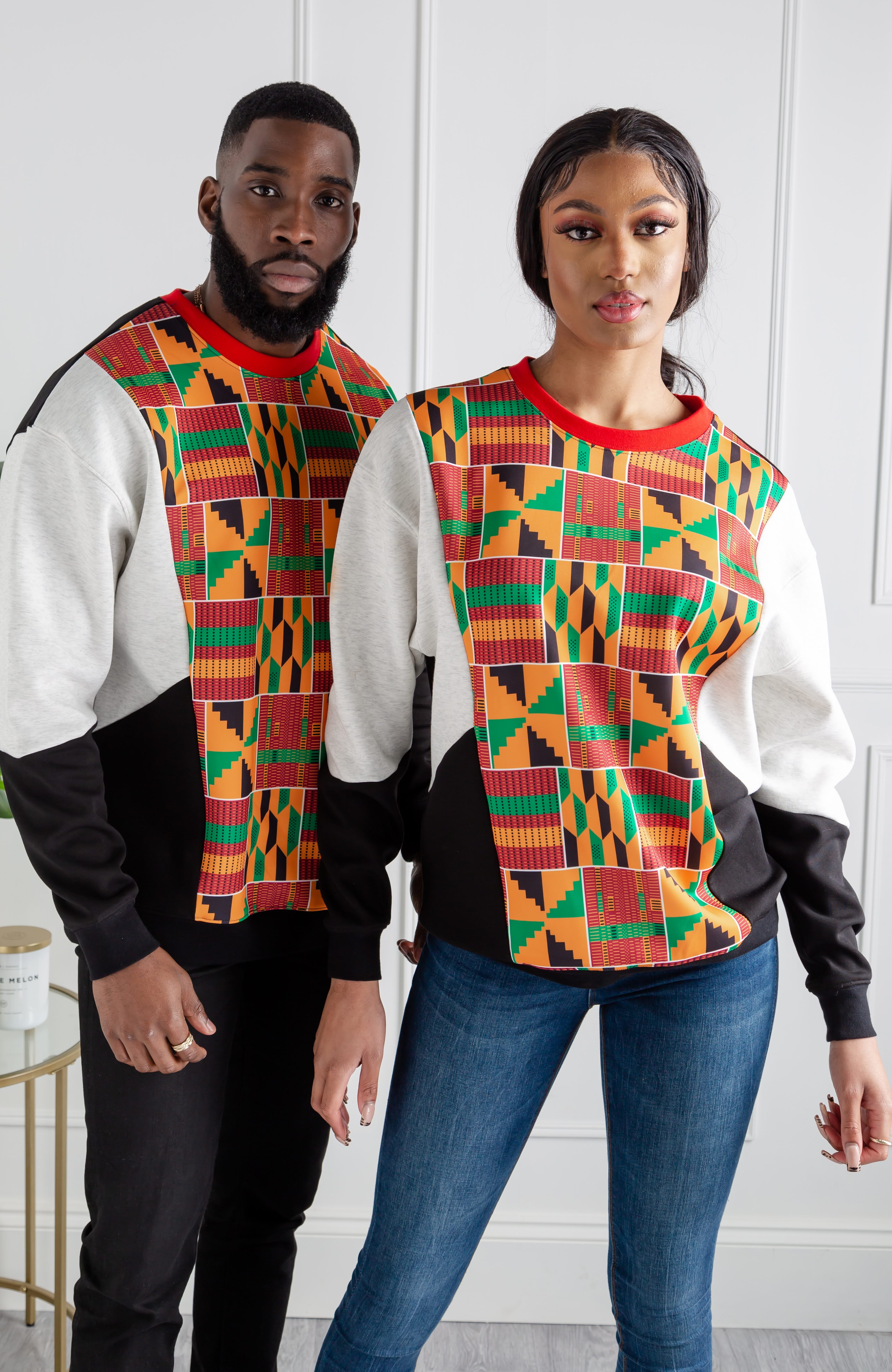 You’ll be the envy of everyone you know when you wear our Crew Neck African Print Sweatshirt. Featuring a powerful Kente Pattern V Block on the front, elasticated waistband and two-tone cuffed sleeves, the Kumasi sweatshirt is the perfect example of Unisex Ankara Sweatshirt. Whether you decide to wear your Crew Neck African Print Sweatshirt with joggers, jeans or shorts, you’re guaranteed to feel amazing! Our Unisex Ankara Sweatshirt has been thoughtfully designed to look incredible on everyone, everywhere!