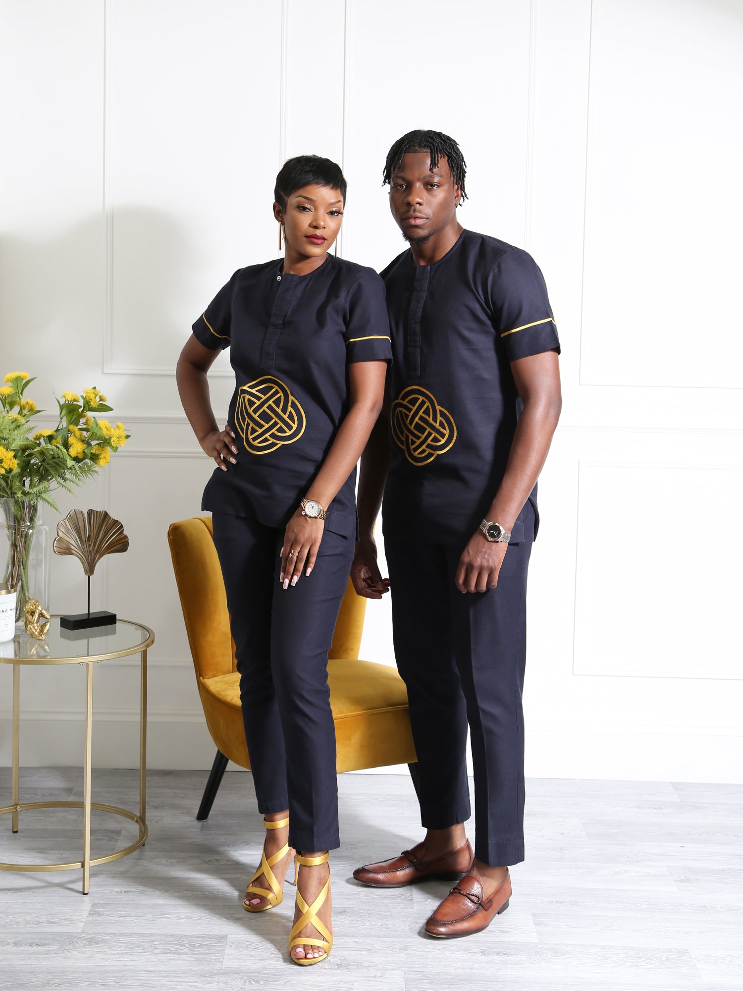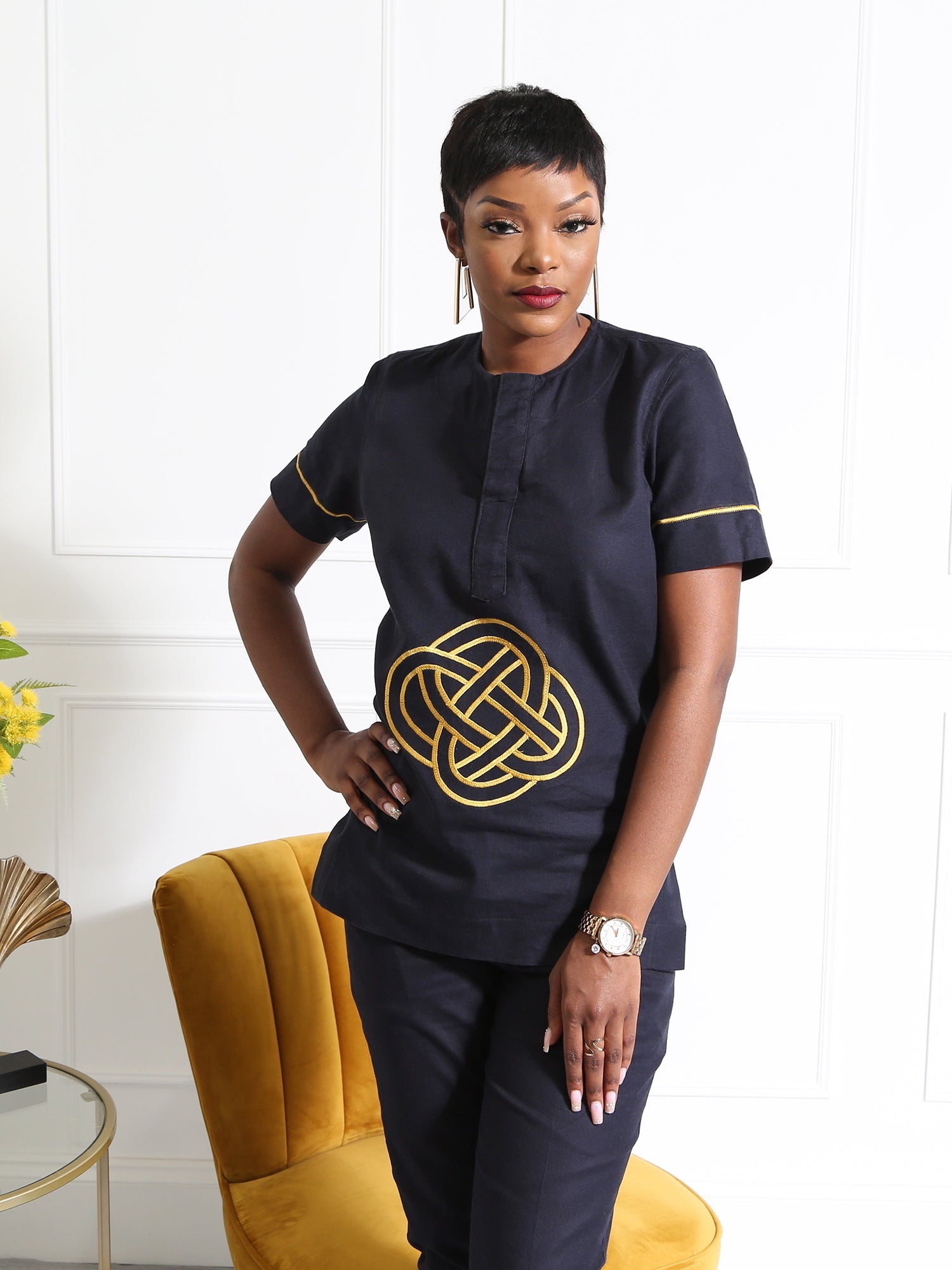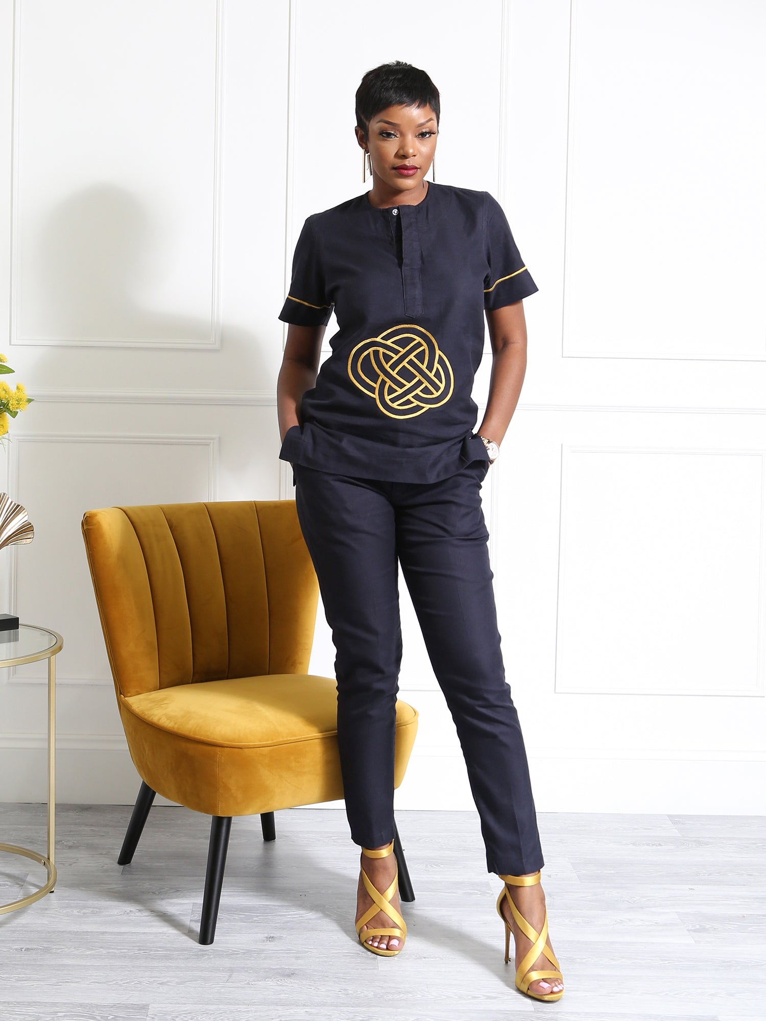 Step into elegance with this Navy Blue Embroidered Women's Two-Piece Set, a perfect combination of African-inspired tradition and contemporary design. The short-sleeve tunic top features intricate golden embroidery at the hem and waist, adding a bold yet refined statement. Paired with tailored slim-fit trousers, this ensemble offers effortless style for formal events, cultural celebrations, and everyday sophistication.