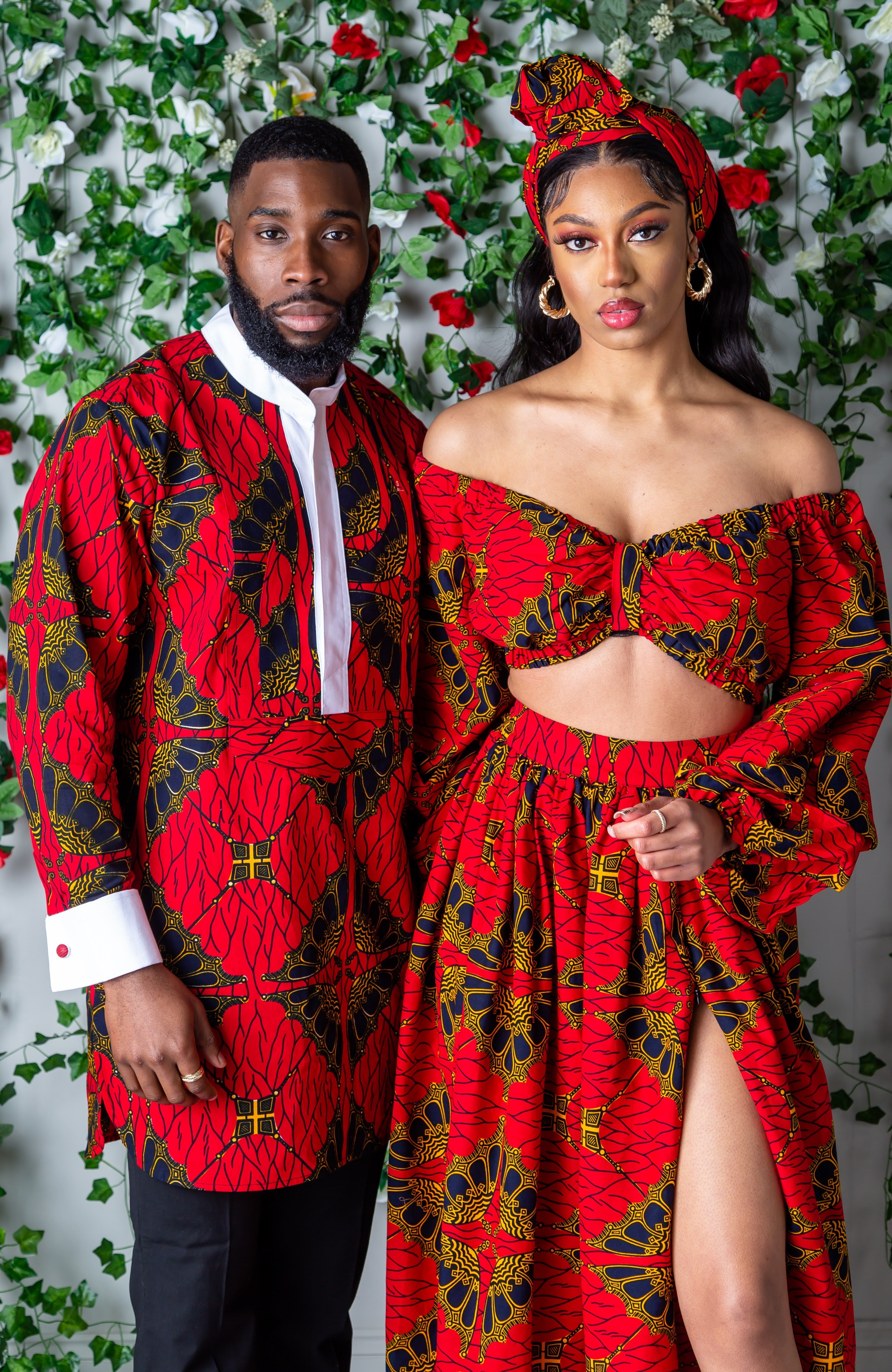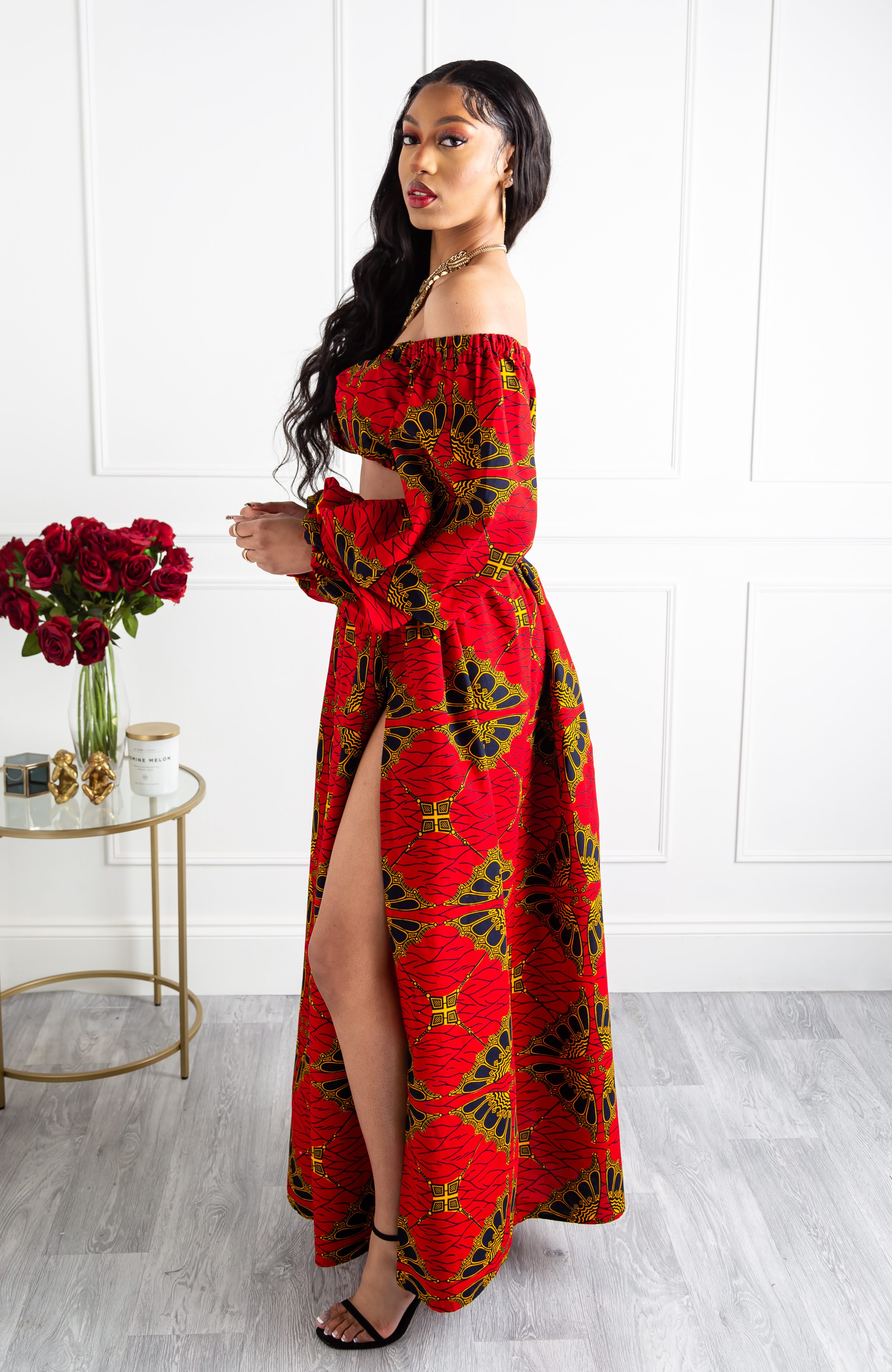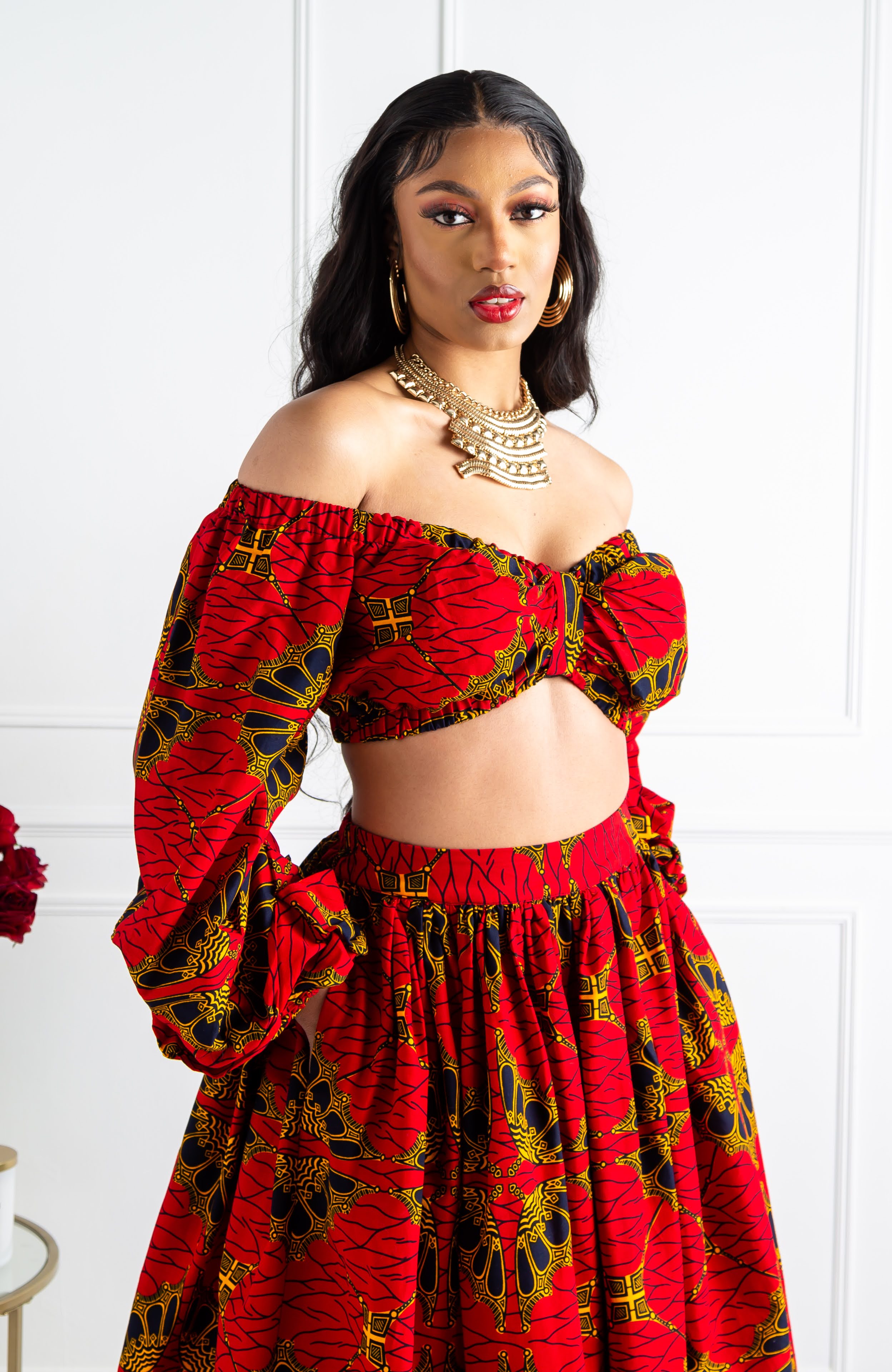 Be bold this season and step out in LAVIYE's gorgeous Red African Print Maxi Skirt & Crop Top Set, we guarantee you will be the centre of attention! Show as much or as little leg as you like with our hidden zipper slit, designed to keep this outfit as versatile as you are! The cropped silhouette and puff off shoulder sleeves perfectly match this vibrant African print fabric for a seriously stylish aesthetic. Pair with killer heels and a cute clutch for instant glam!