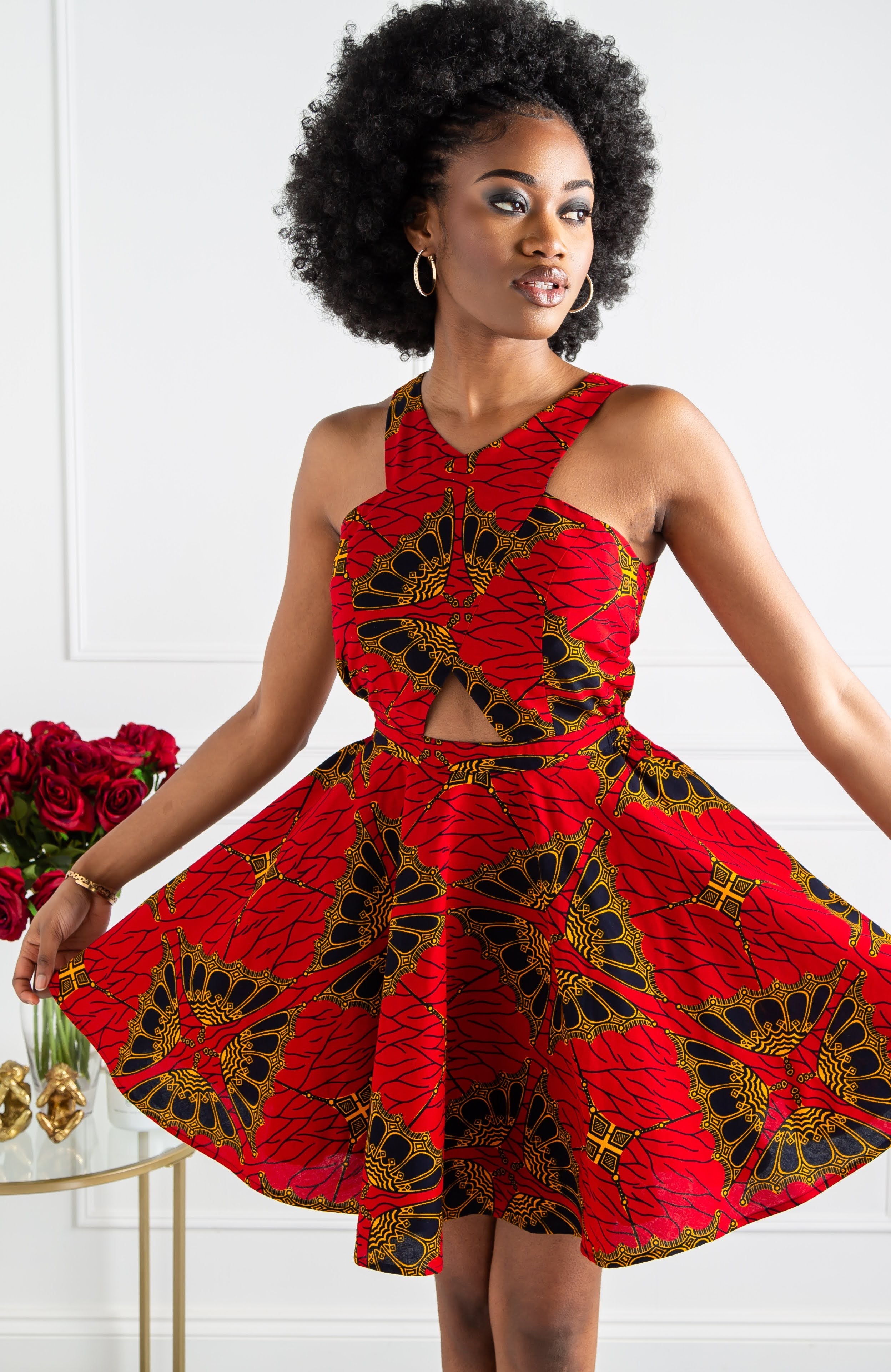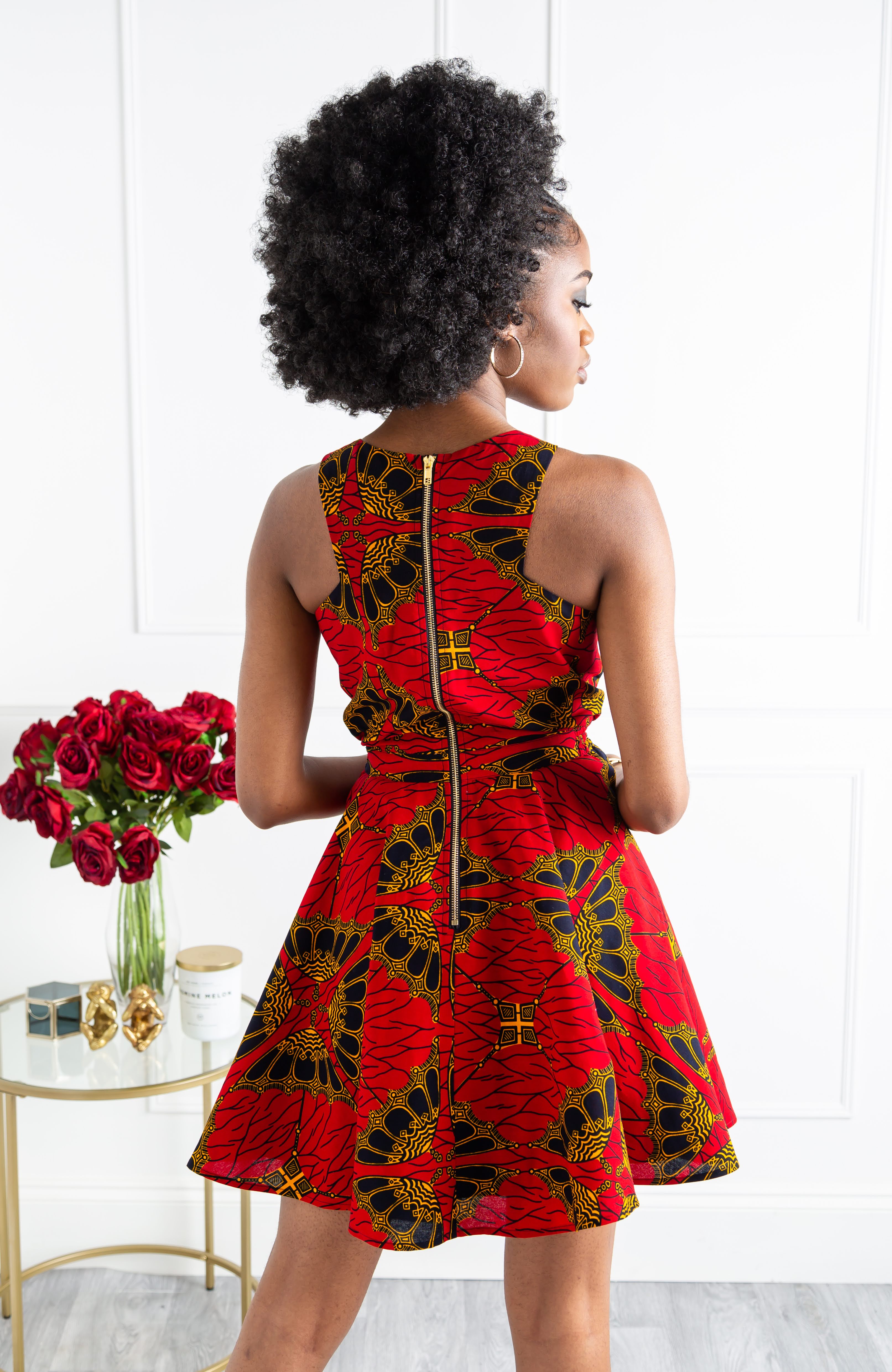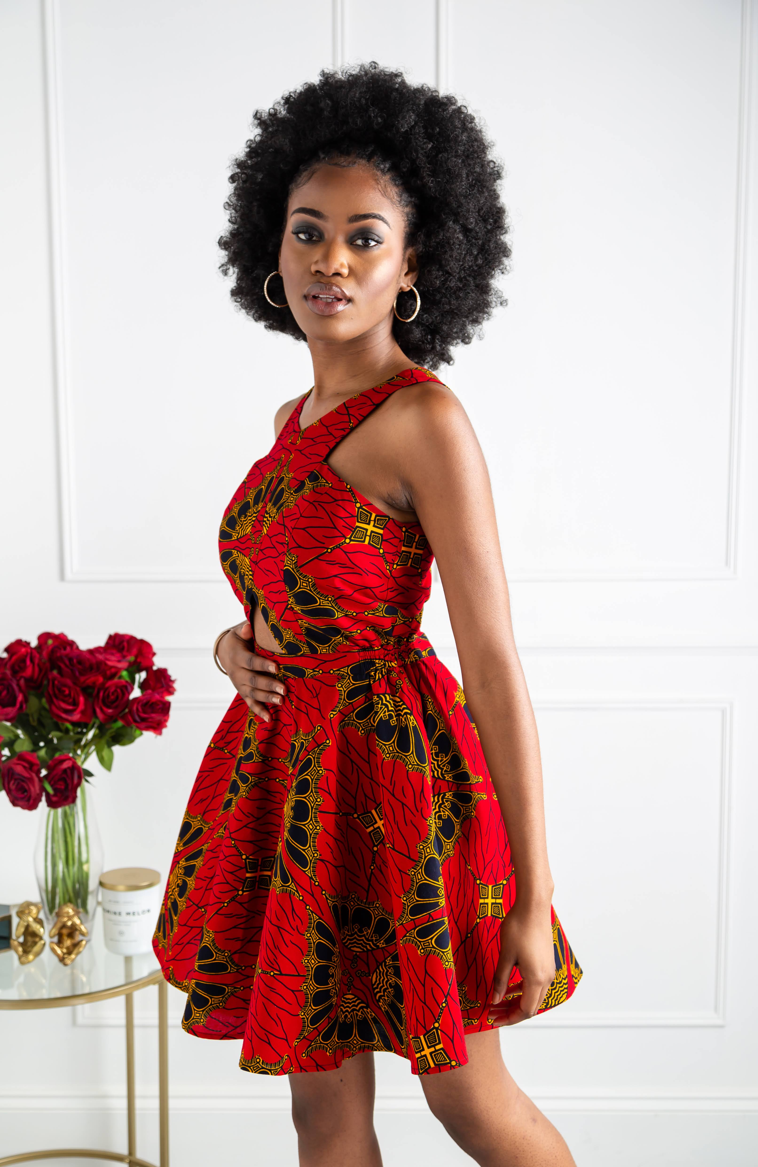 You'll look cute in this Red Ankara Cross Front Mini Length Dress from LAVIYE. Made from 100% African cotton, our mini dress features a cut out cross design at the front and a statement back zipper. Featuring an elasticated waistband to fit you perfectly and side pockets for practicality, this versatile mini dress will be your go to for every occasion, whether its a night out with friends or a date with that special someone!