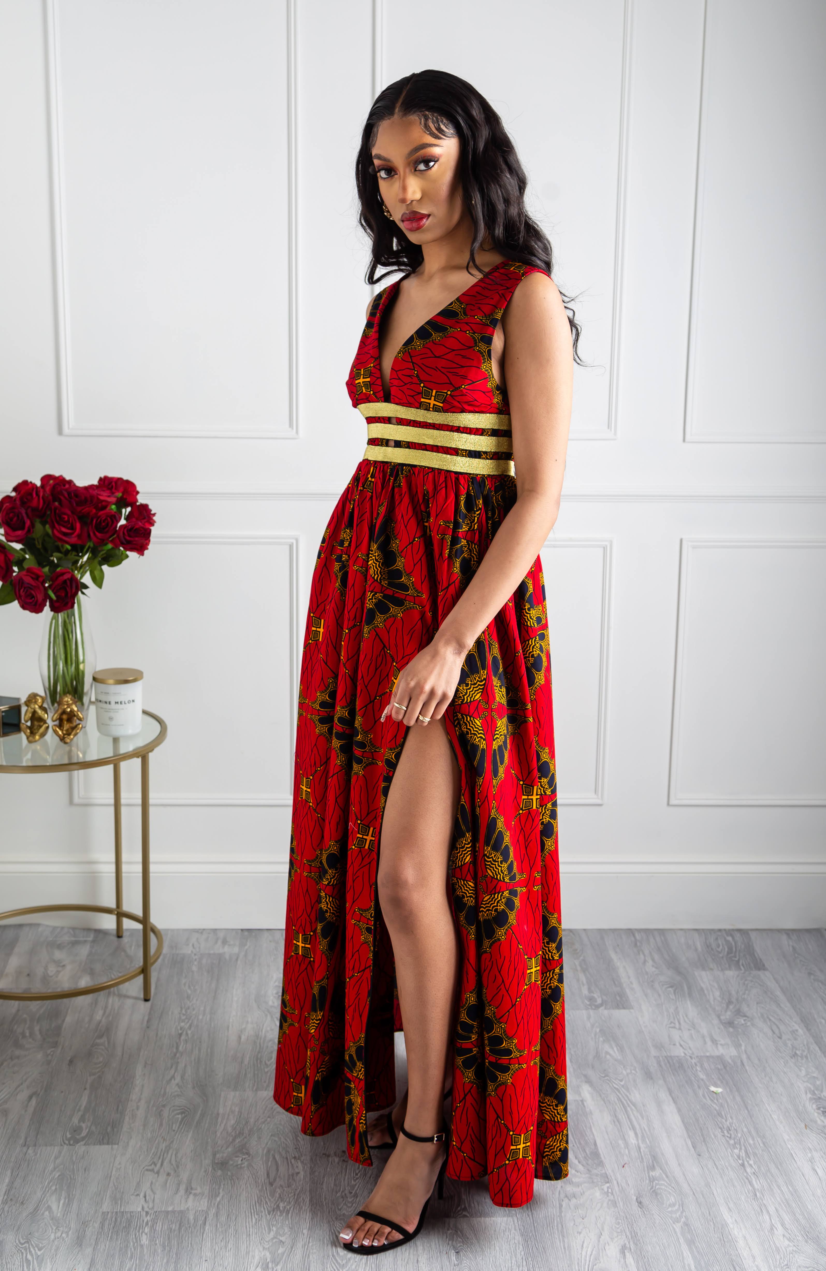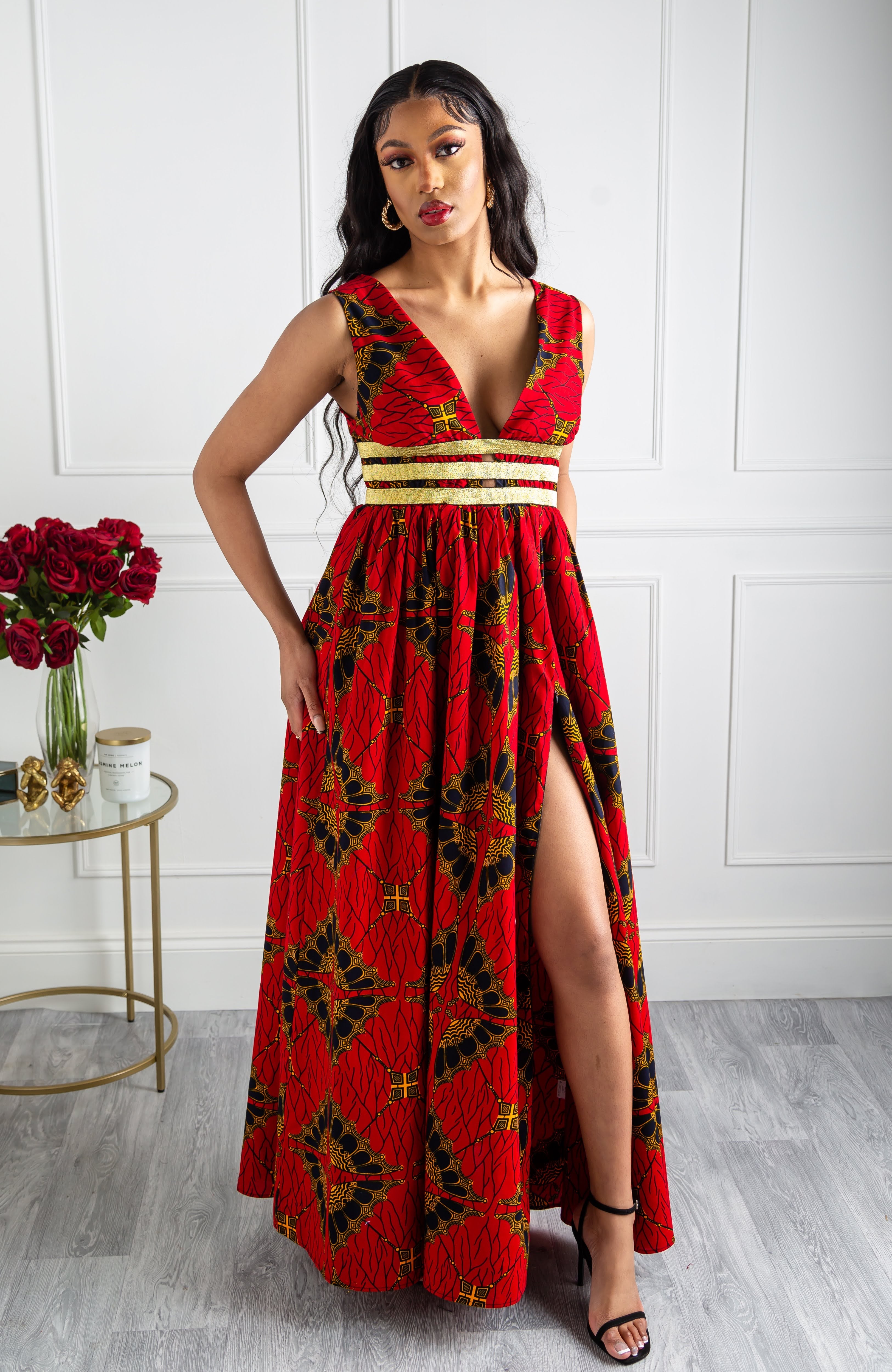 Give yourself the WOW factor you deserve in this sexy, stylish and sparkly maxi dress from LAVIYE! This Red Ankara Plunge Neckline Maxi Dress is guaranteed to steal the show with its side-slit hidden zipper and stand-out glittery waist bands. Pair this dress with your favourite statement jewellery for a look that's certain to turn heads!
