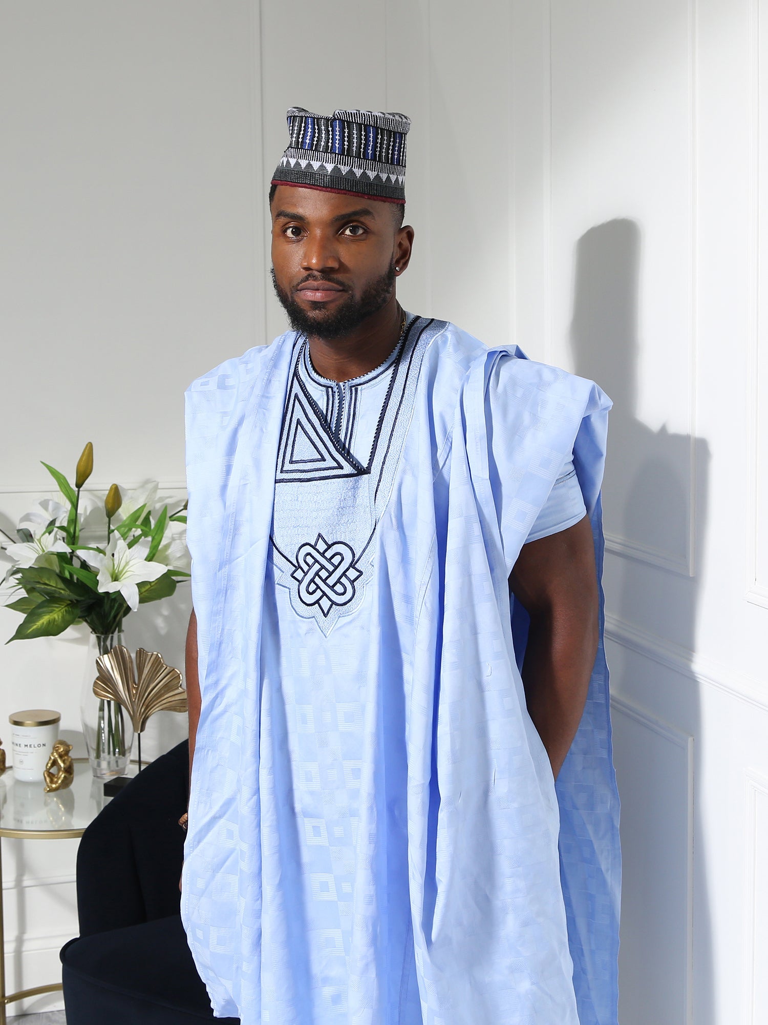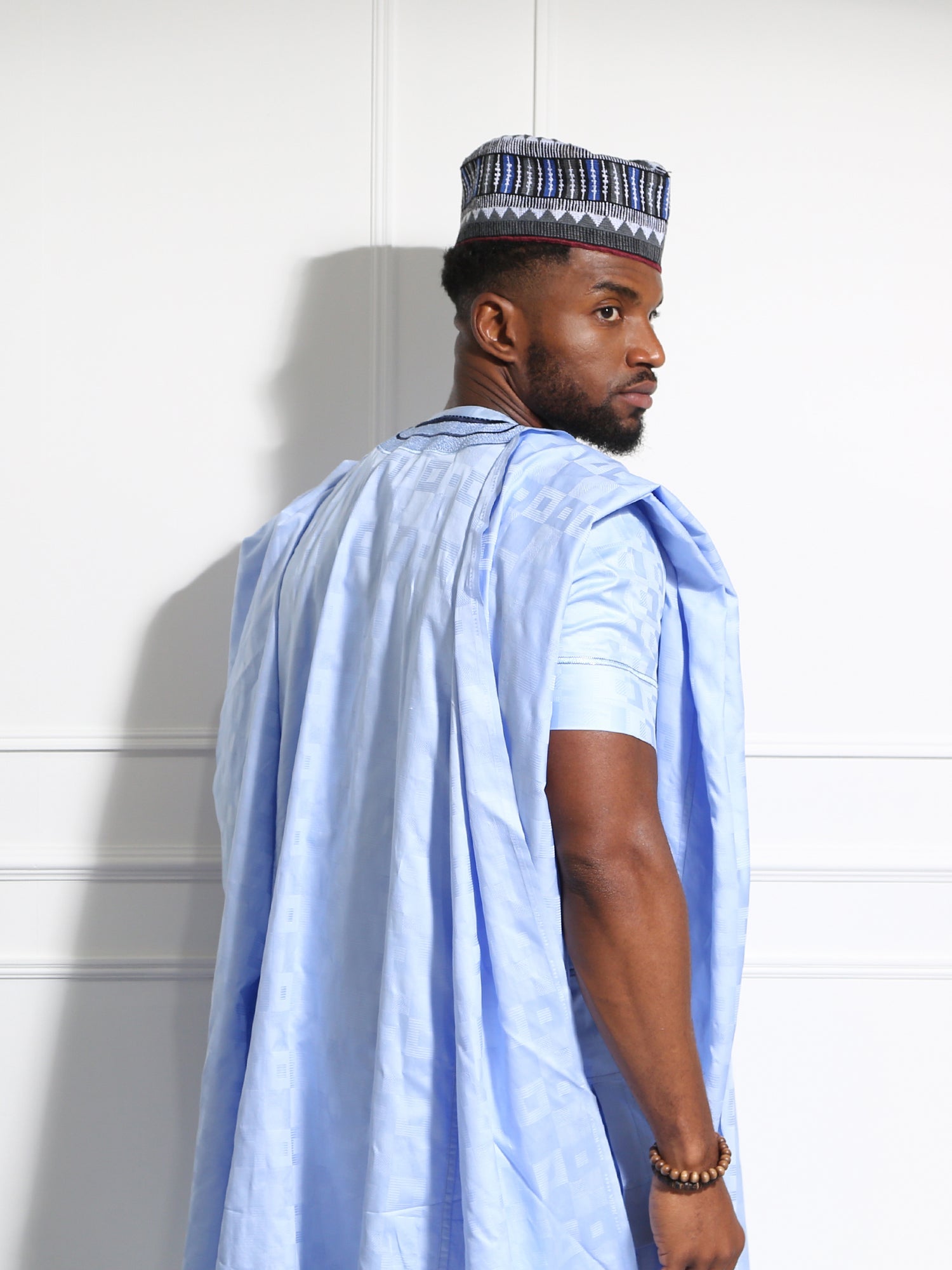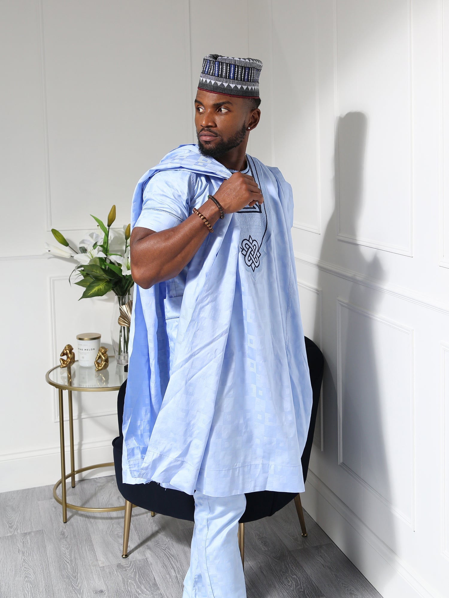 Elevate your style with this Sky Blue Men's Agbada Set, perfect for anyone seeking elegant African men's formal wear. This traditional Nigerian attire is crafted from premium sky-blue fabric with subtle jacquard patterns, making it ideal for weddings, cultural celebrations, and special occasions. The embroidered tunic features intricate traditional geometric embroidery along the chest and neckline, symbolizing heritage and modern sophistication.