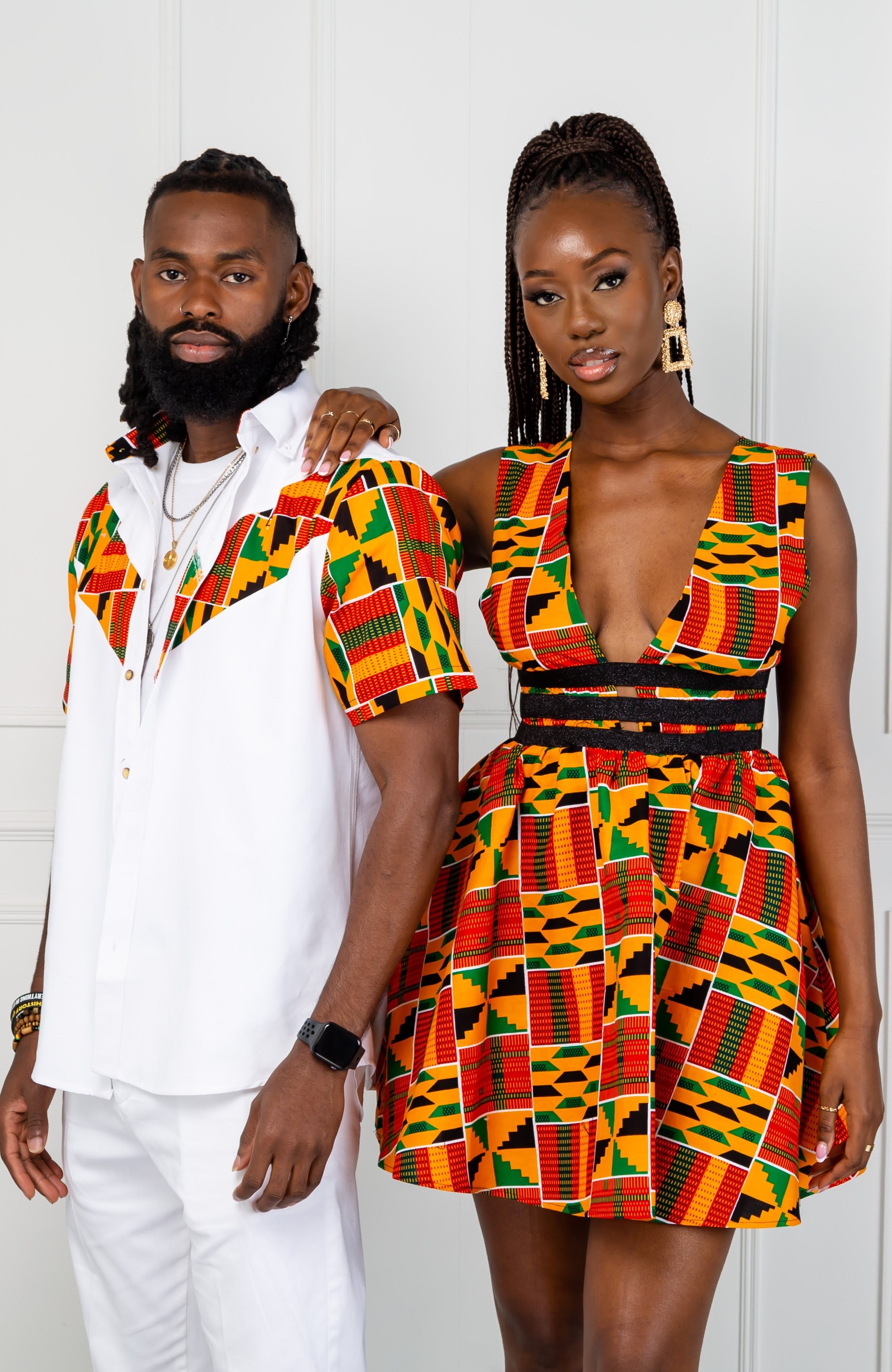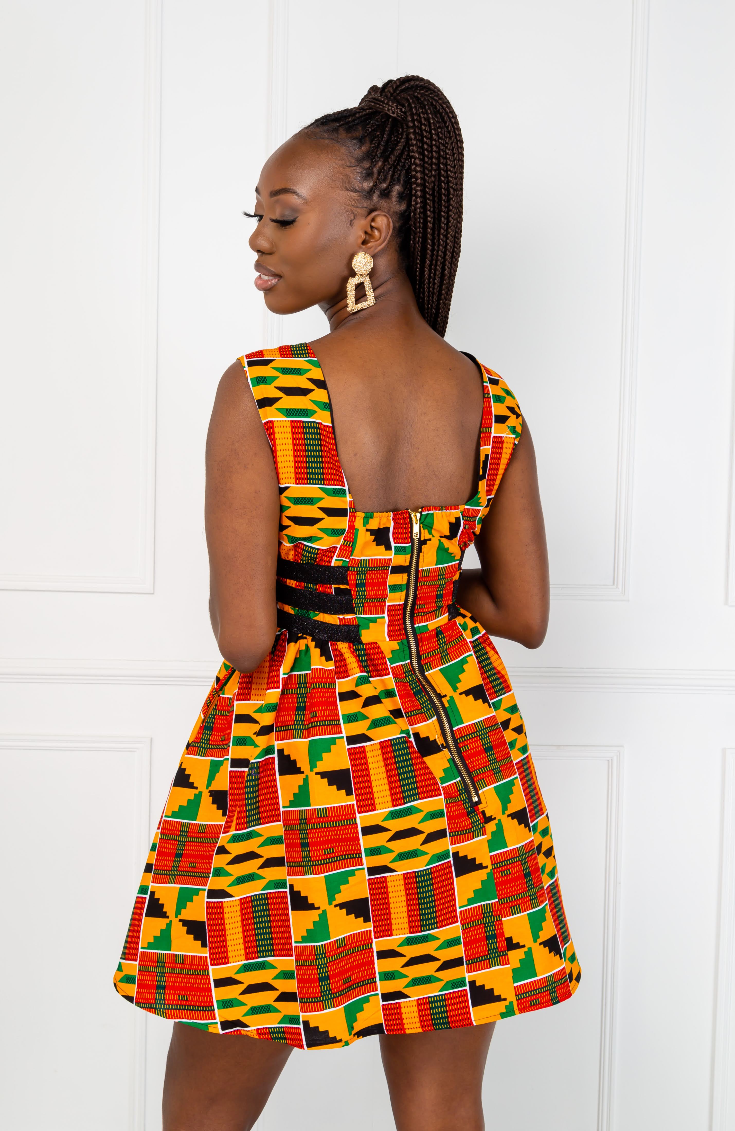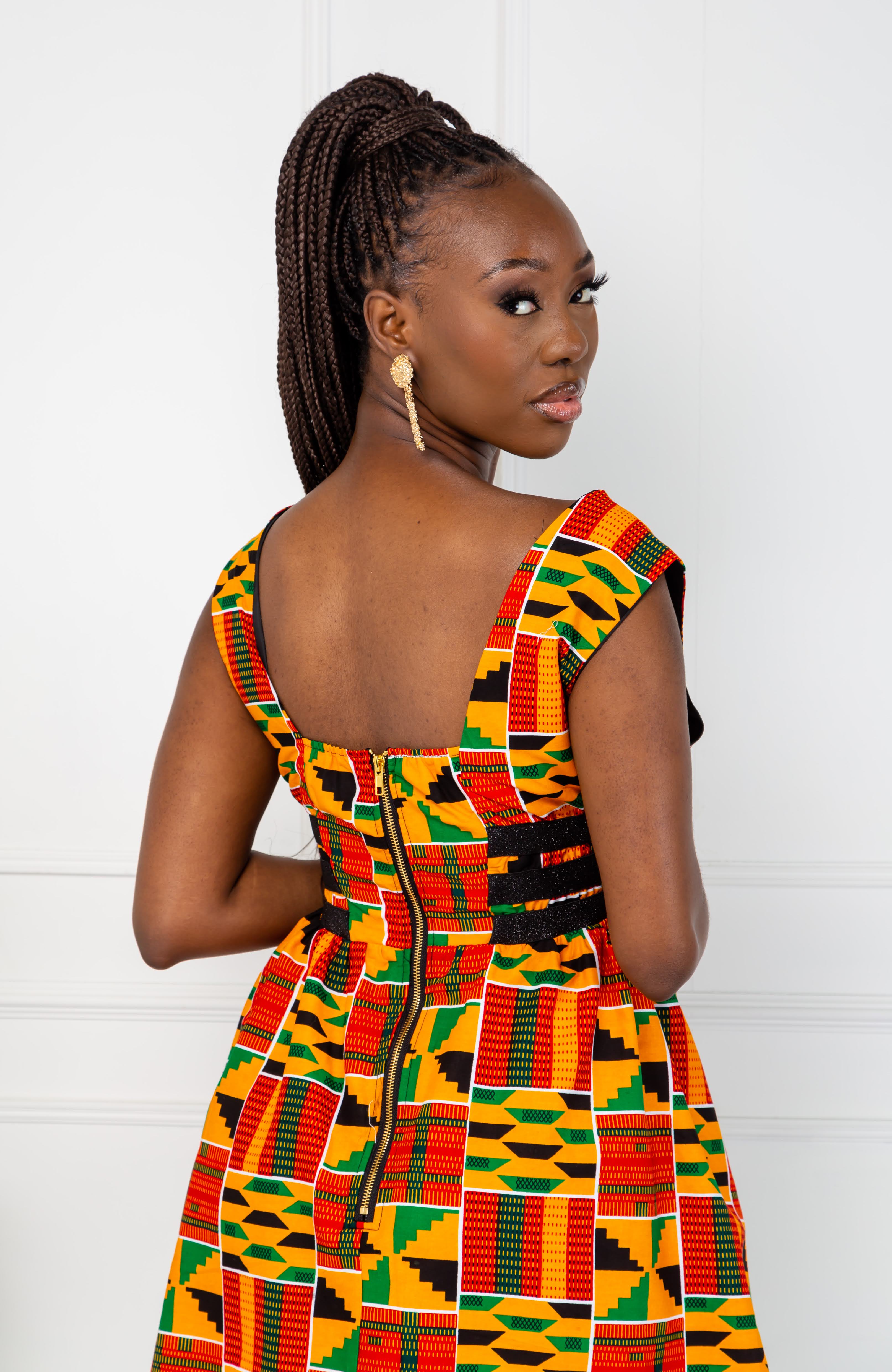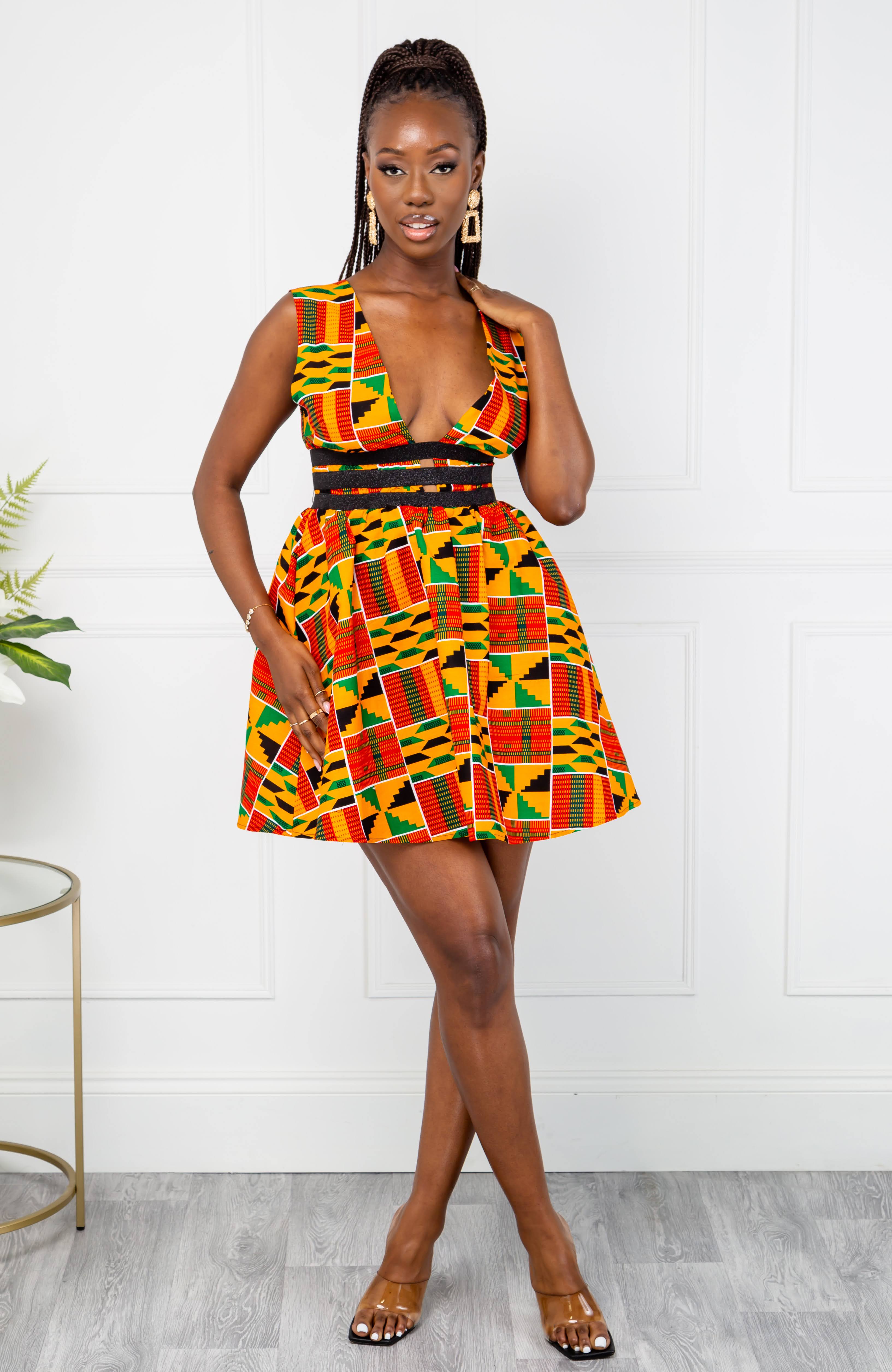 Steal the show with this sexy Ankara mini dress! LAVIYE's African Print midi dress features a deep plunge neckline design with fashionable black glittery waistbands for standout appeal. Pair this dress with your favourite statement earrings for a show-stopping look.
